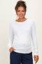 A solid hued, long sleeve plus size maxi dress featuring elastic cinching under the bust and an off the shoulder neckline. Double lined in bust to prevent sheerness.