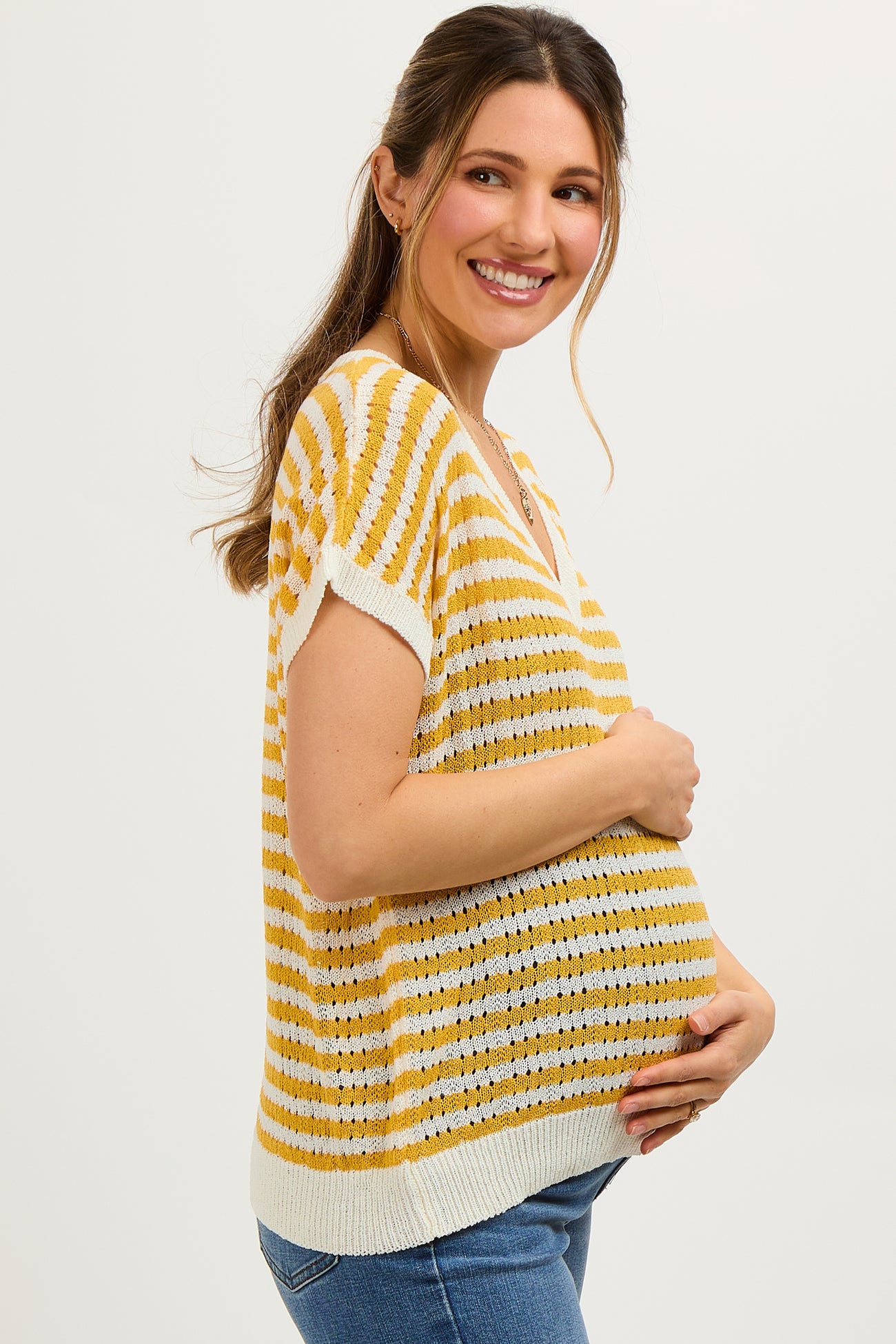 Mustard Striped Knit V-Neck Short Sleeve Maternity Top