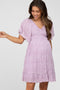A striped maternity maxi dress featuring an off-shoulder neckline, a front drawstring, a smocked elastic top and a ruffle bottom.