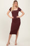 A rib knit dress with a rounded neckline, long drop shoulder sleeves, side pockets, side slits, and a rounded hem.