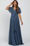 A solid maternity top with a boatneck, short dolman sleeves, and side slits at the hemline.
