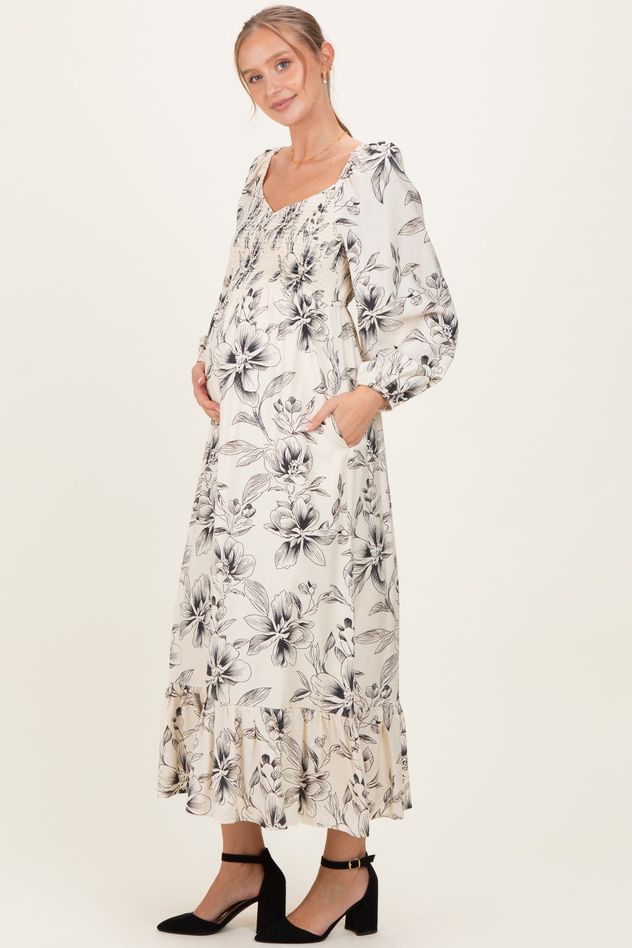 Cream Floral Smocked Long Sleeve Maternity Maxi Dress