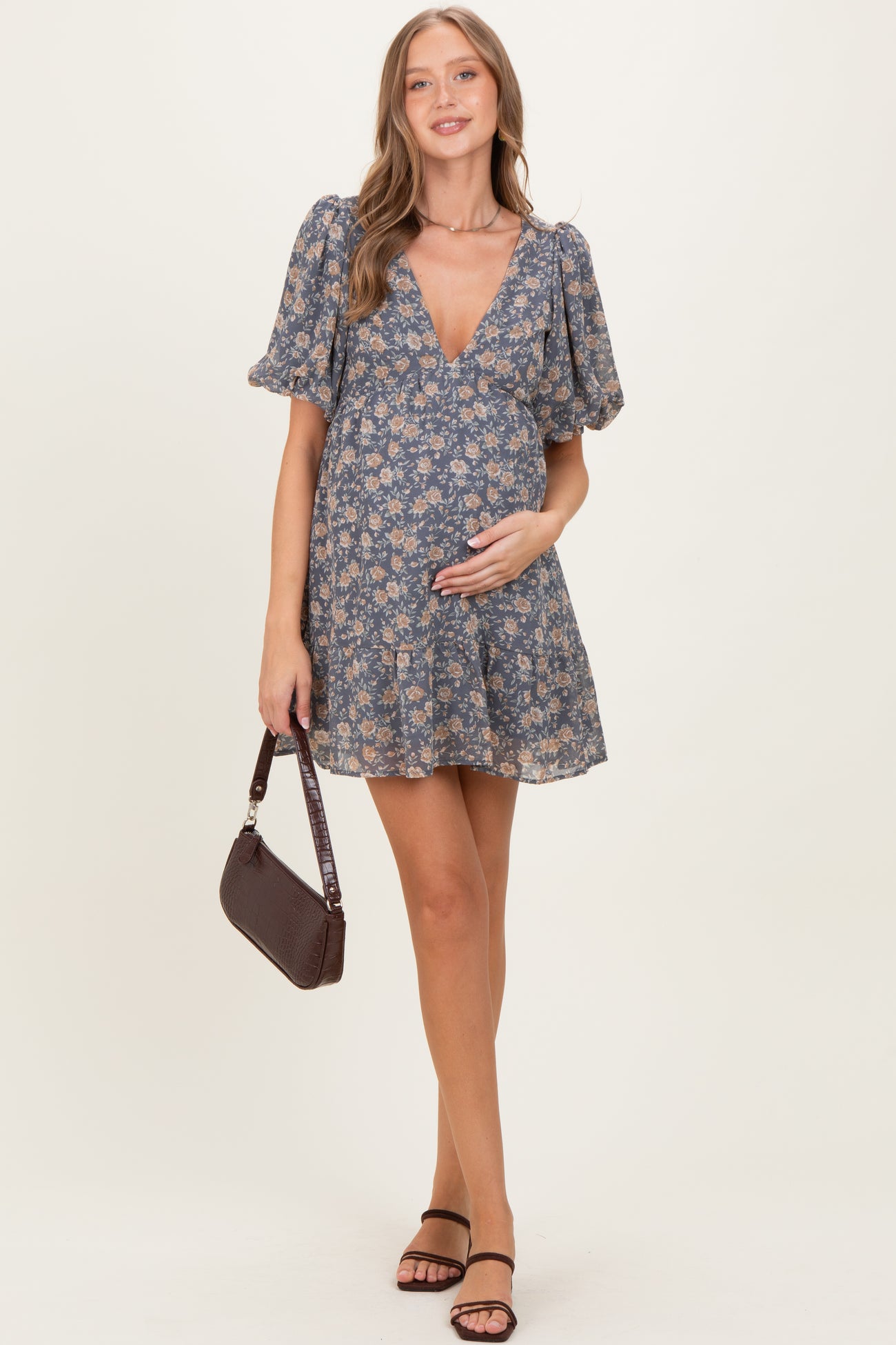 Elevate your maternity wardrobe with this charming floral mini dress designed to keep you both comfortable and stylish throughout your pregnancy. Featuring a flattering V-neckline and short puff sleeves, this dress provides a breathable and airy fit perfect for warmer days. The flowing A-line silhouette gently skims over your baby bump, allowing for ease of movement and a relaxed feel. Crafted from soft, lightweight fabric, it offers all-day comfort while maintaining a chic look. Pair it with sandals or heels for a casual outing or a special event. A must-have staple for maternity wear that effortlessly combines fashion and function.