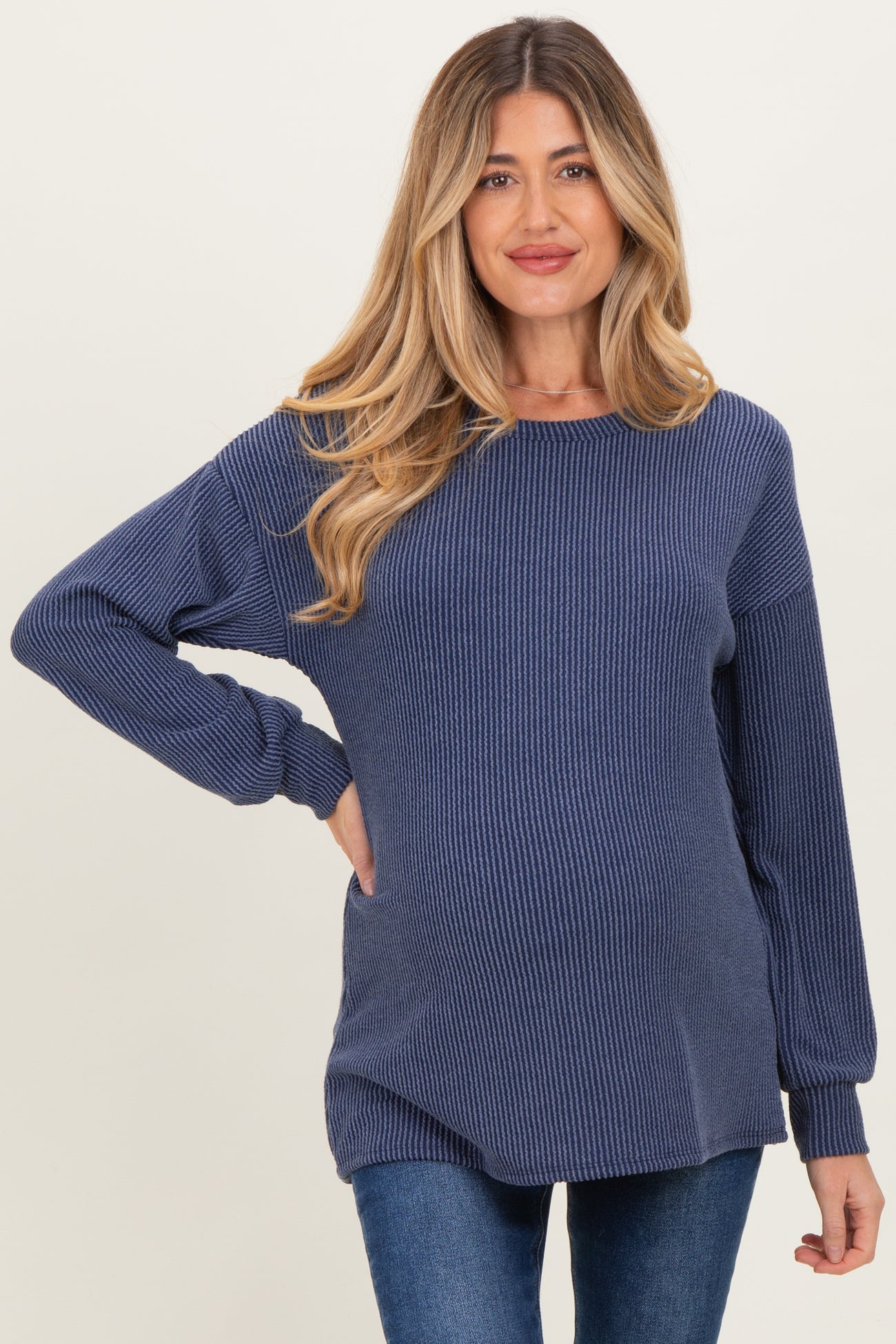 Navy Puff Sleeve Solid Ribbed Maternity Top