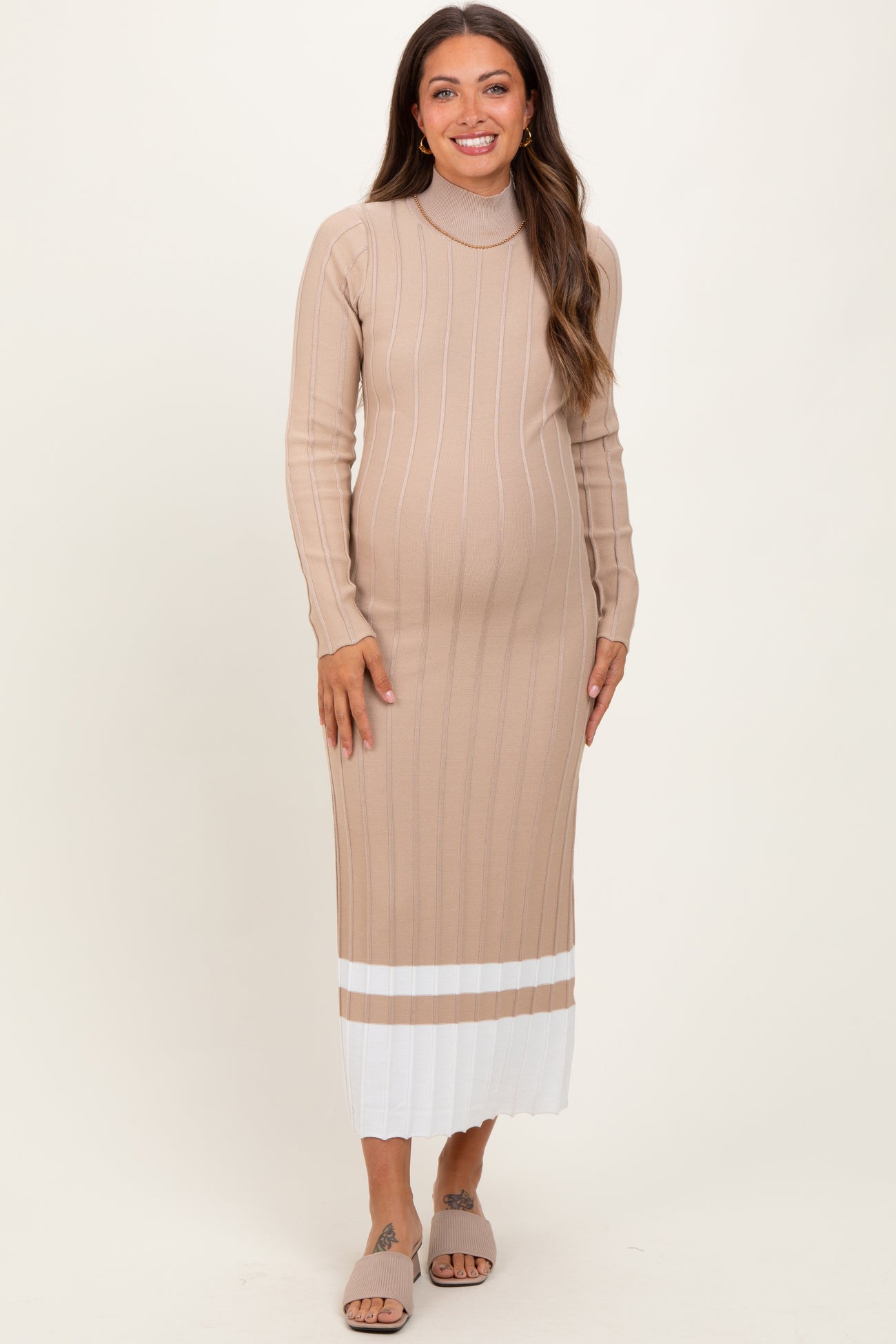 Beige Colorblock Hem Mock Neck Maternity Sweater Dress