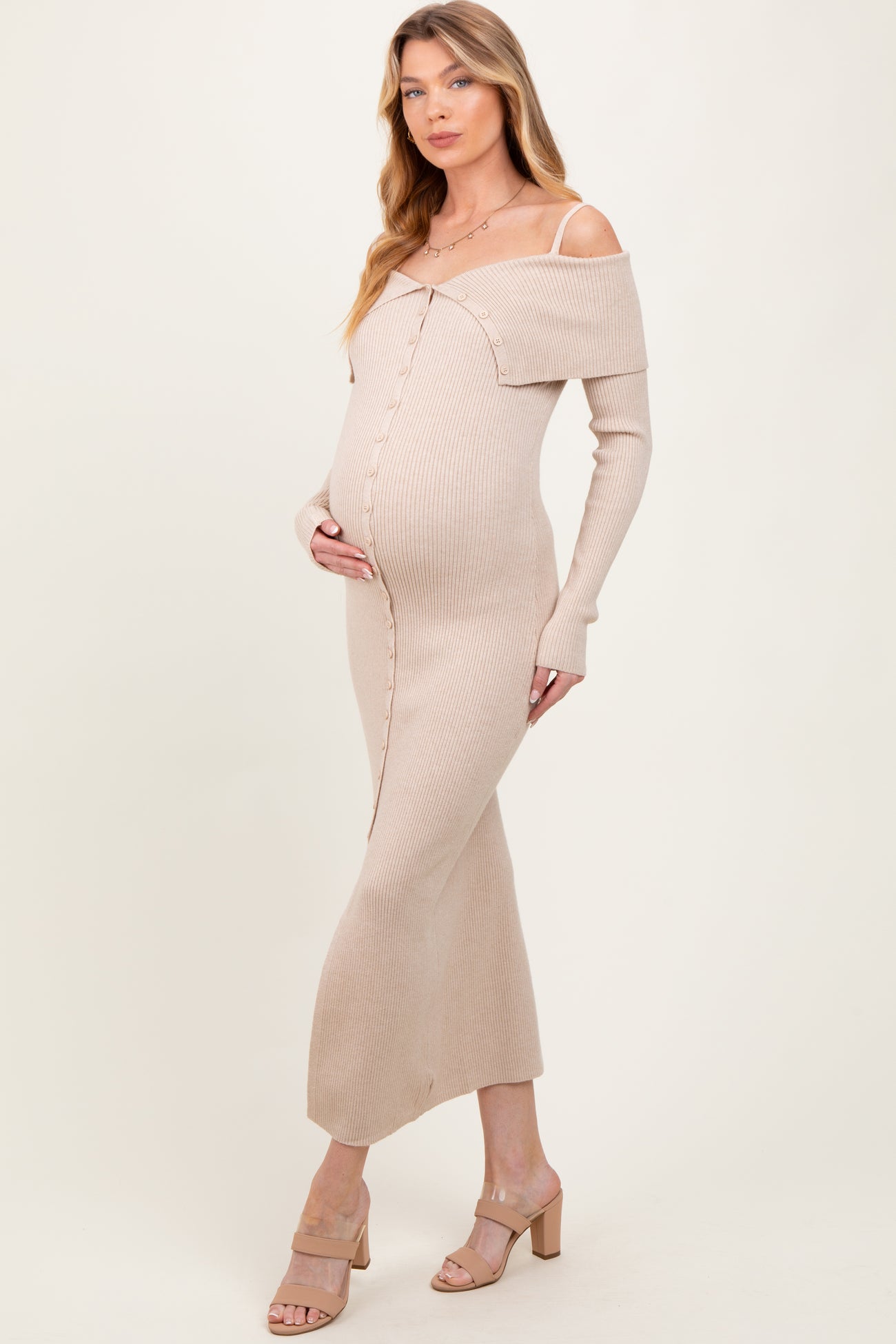 Embrace elegance and comfort with our Beige Off Shoulder Long Cardigan Maternity Maxi Dress. Crafted from soft, ribbed knit fabric, this dress gently hugs your baby bump while offering stretch for growing curves. The off-shoulder neckline adds a trendy, feminine touch, complemented by button detailing down the front for easy wear and nursing access. Long sleeves provide warmth without sacrificing style, making it perfect for any season. The maxi length enhances a graceful silhouette, ideal for casual outings or special occasions. Elevate your maternity wardrobe with this chic, versatile piece designed to support you throughout your pregnancy journey.