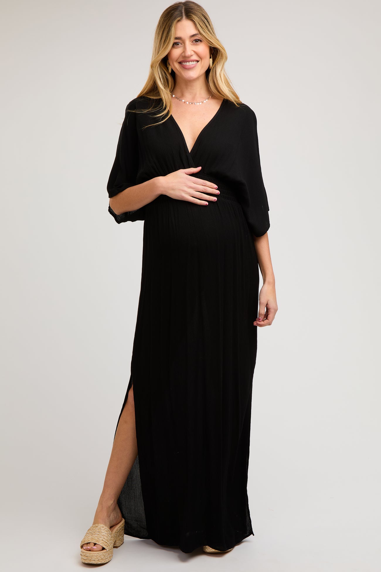 A lightweight maternity maxi dress with a smocked waist, a deep v-neckline, short dolman sleeves, a back tie, and side slits.