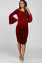 A velvet maternity fitted dress featuring a rounded neckline, long bell sleeves, and ruched sides.