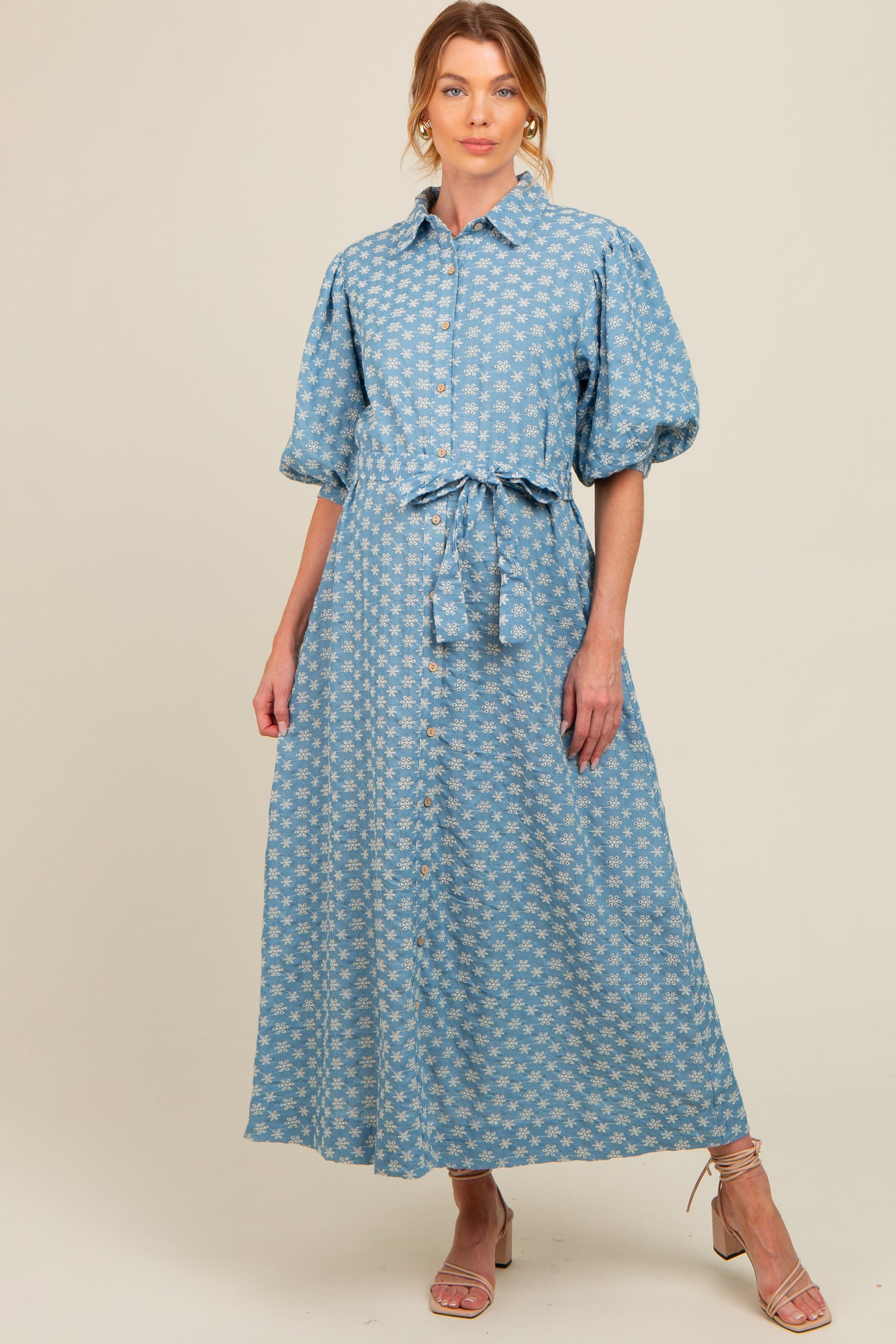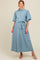 Embrace effortless style and comfort with our Blue Floral Embroidered Button Down Chambray Maternity Maxi Dress. Designed with soft, breathable chambray fabric, this dress features delicate white floral embroidery for a charming, feminine touch. The button-down front and adjustable waist tie provide a customizable fit that grows with you, while the puffed elbow-length sleeves add a trendy flair. Perfect for casual outings or special occasions, this maxi dress combines timeless elegance with maternity-friendly design, ensuring you feel beautiful at every stage. Pair with sandals or heels for a complete look.