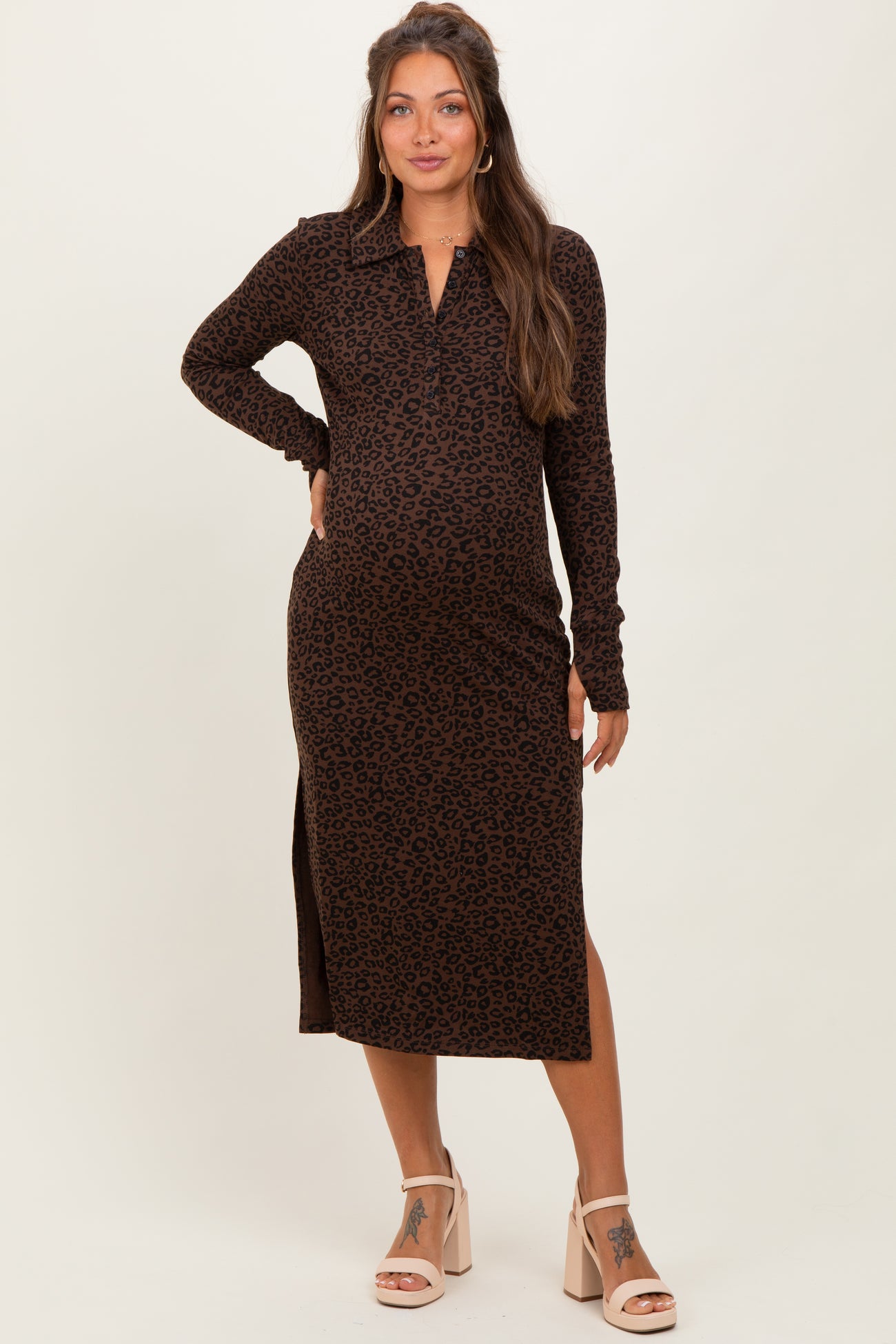 Embrace stylish comfort with our Brown Animal Print Collared Maternity Midi Dress, designed to flatter your bump and keep you cozy all day. Made from soft, stretchy fabric, this dress features a chic animal print pattern, a classic collar, and a flattering midi length with side slits for easy movement. The long sleeves with thumbholes add a trendy touch, while the tailored fit adapts perfectly to your changing shape. Whether for casual outings or special occasions, this dress offers effortless maternity style and comfort you’ll love. Pair it with your favorite shoes for an on-trend look!