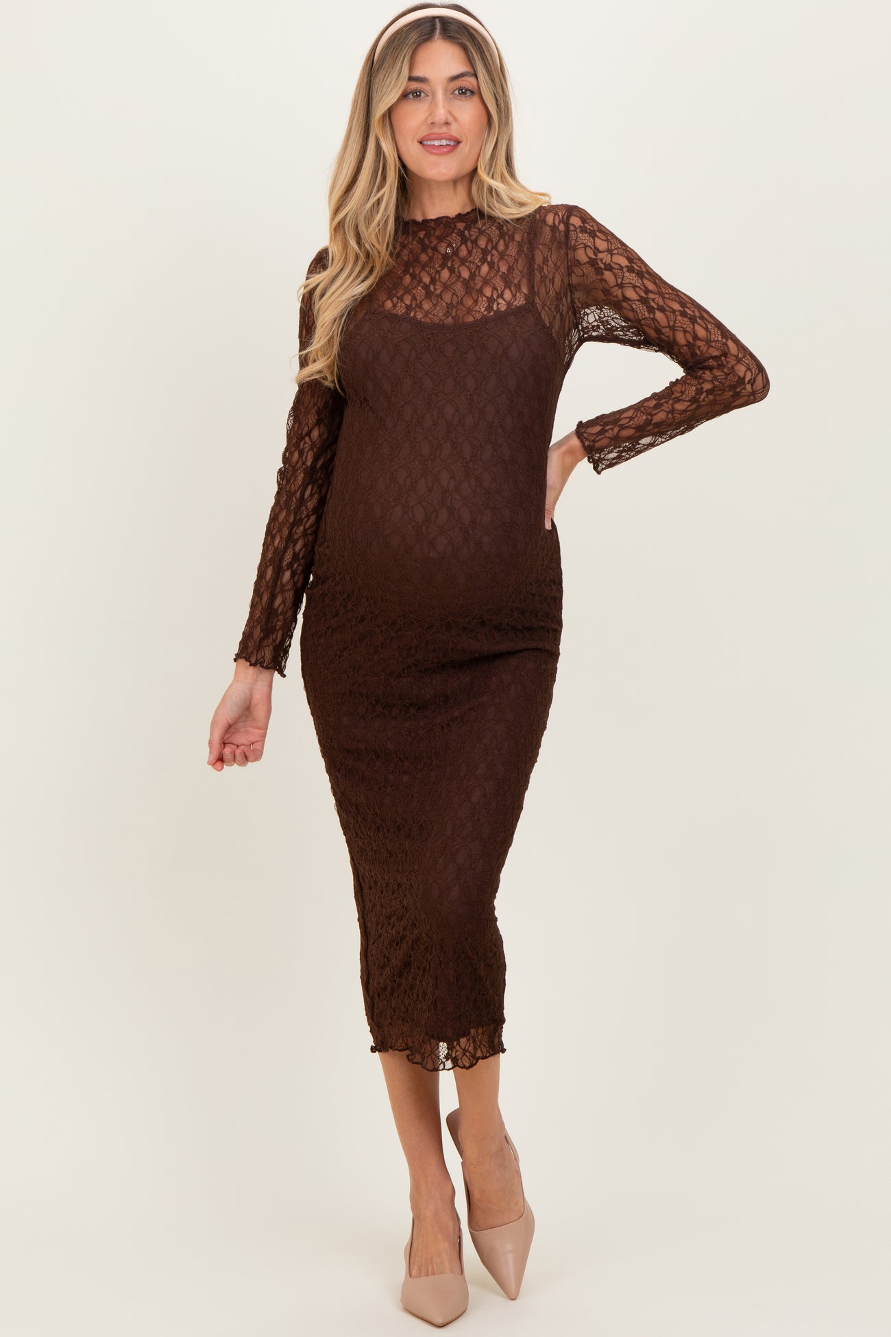 Elevate your maternity wardrobe with this stunning Brown Lace Overlay Fitted Maternity Midi Dress. Crafted with delicate lace, this dress features a flattering body-hugging silhouette that beautifully embraces your baby bump. The midi length adds elegance, while the sheer long sleeves and high neckline offer a sophisticated touch. Perfect for special occasions or stylish everyday wear, this dress combines comfort and fashion seamlessly. Pair it with heels for a chic look that celebrates your journey in style. Available in multiple sizes to grow with you throughout pregnancy.