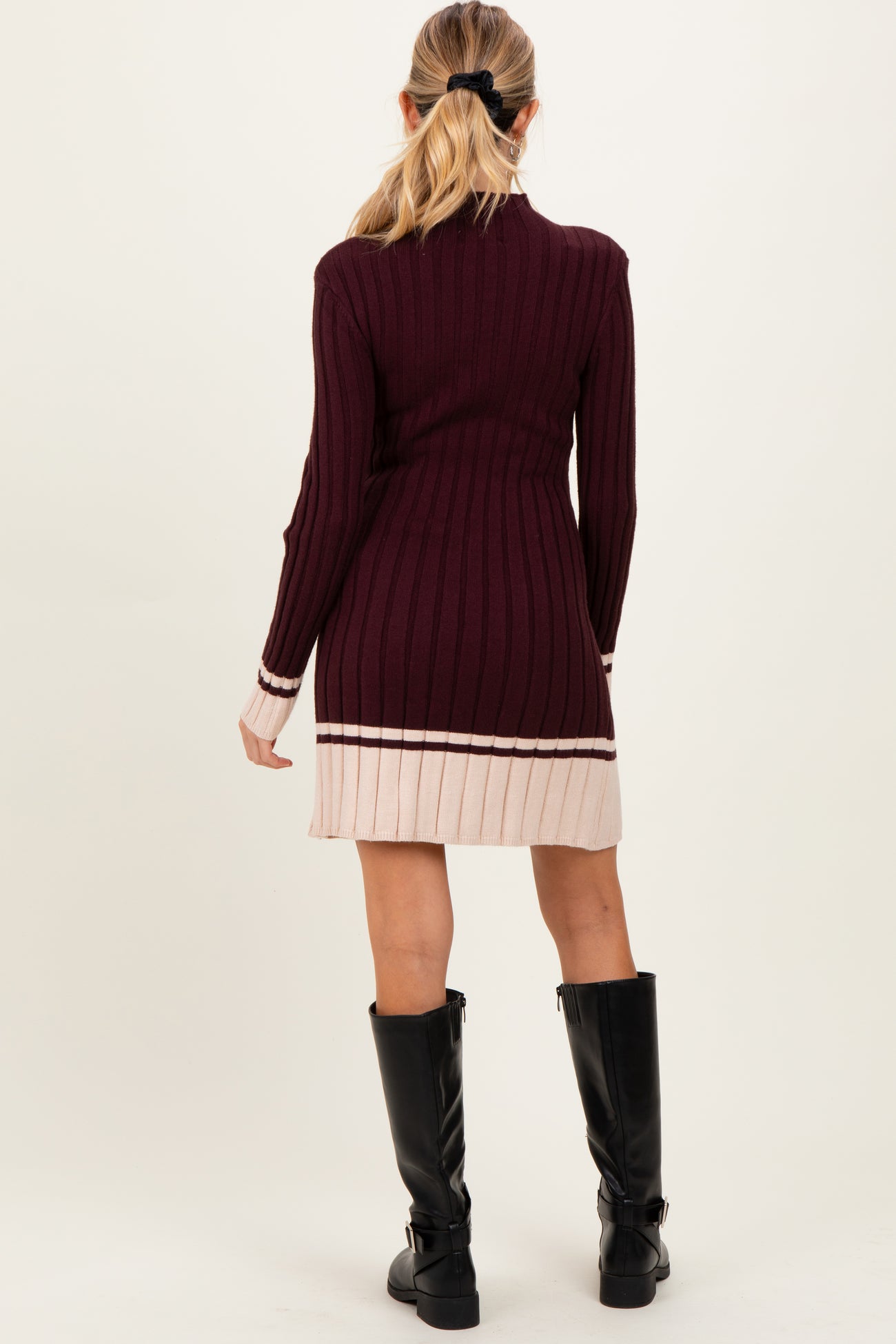 Burgundy Ribbed Contrast Hem Maternity Sweater Dress