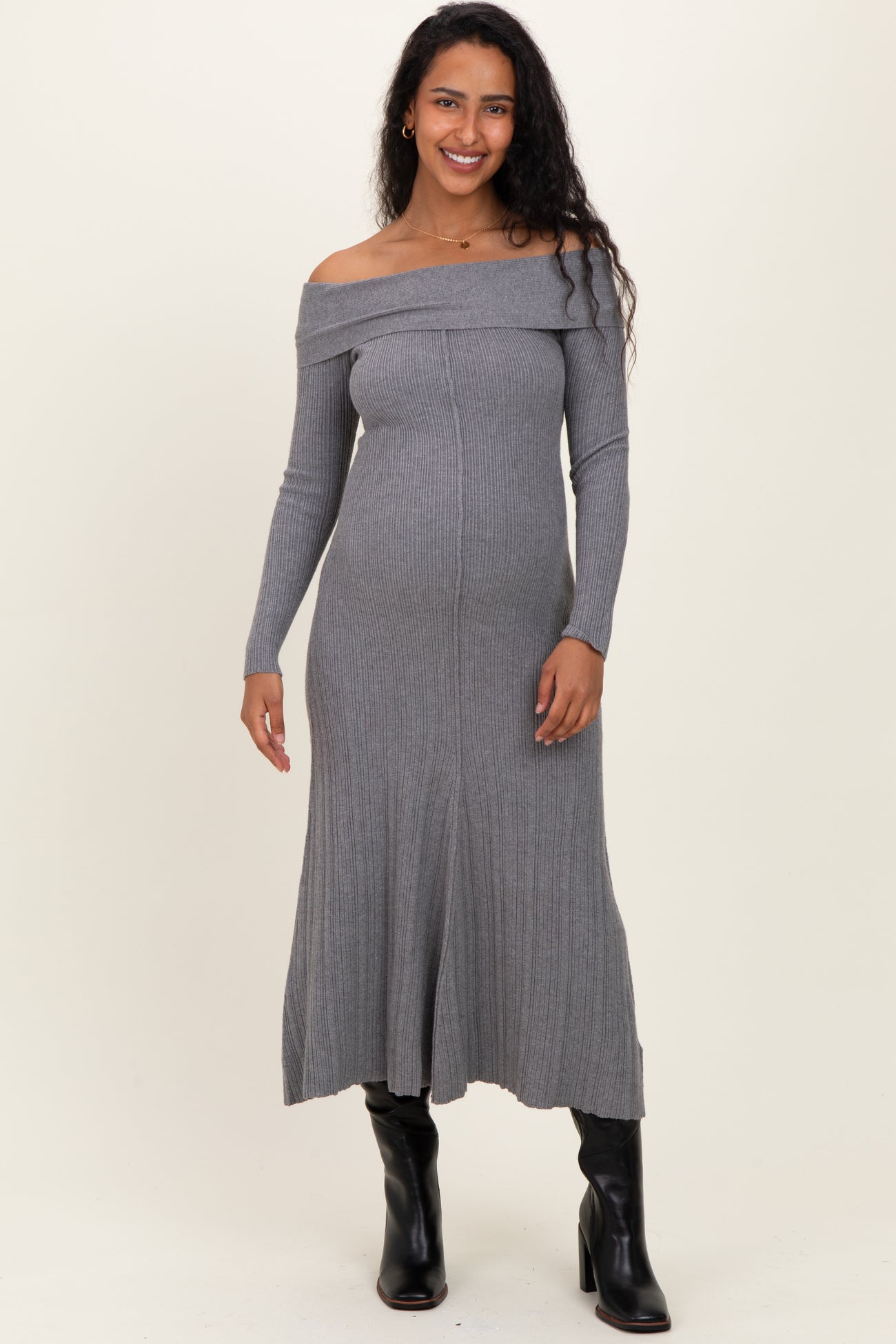 Heather Grey Ribbed Knit Off Shoulder Maternity Midi Dress