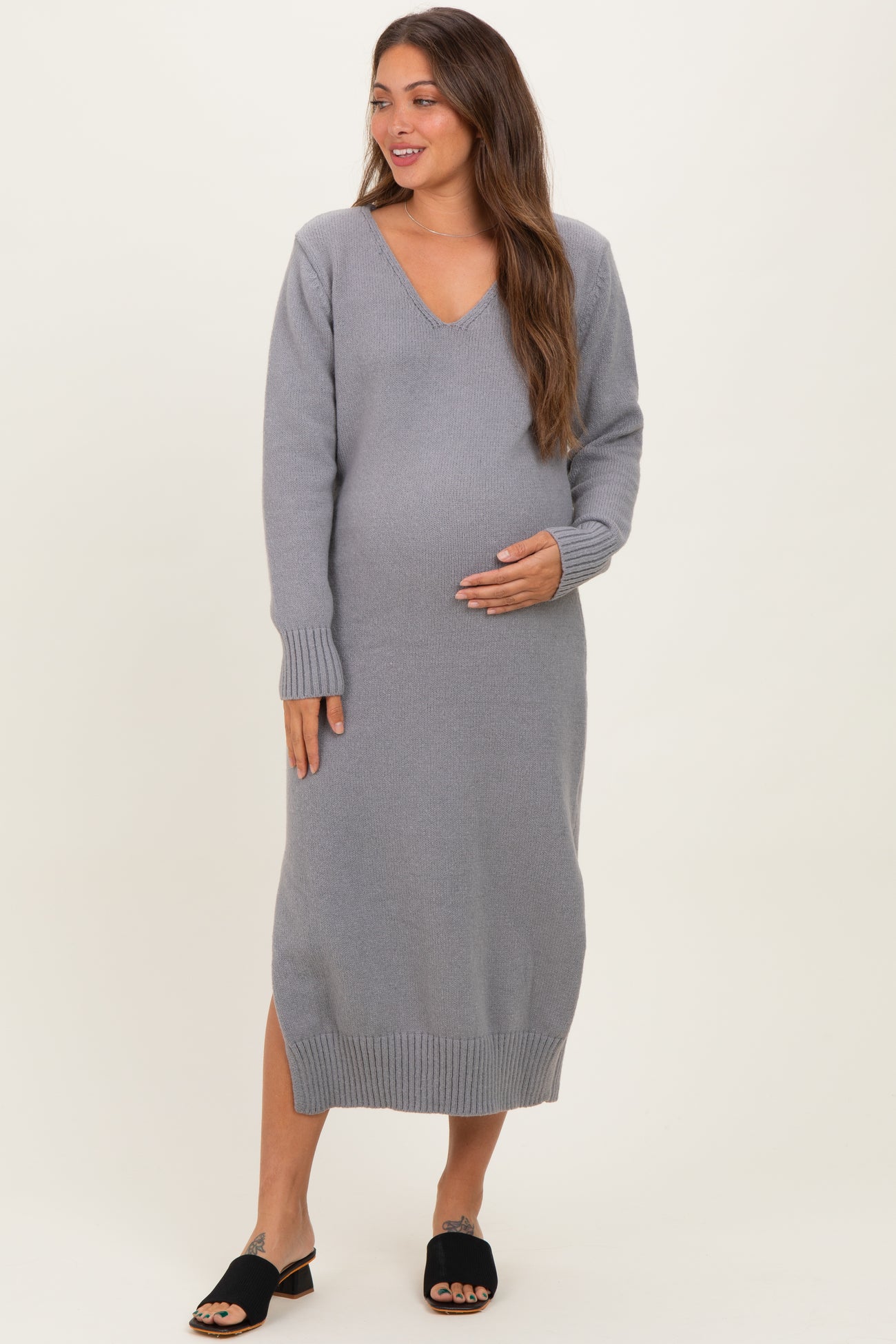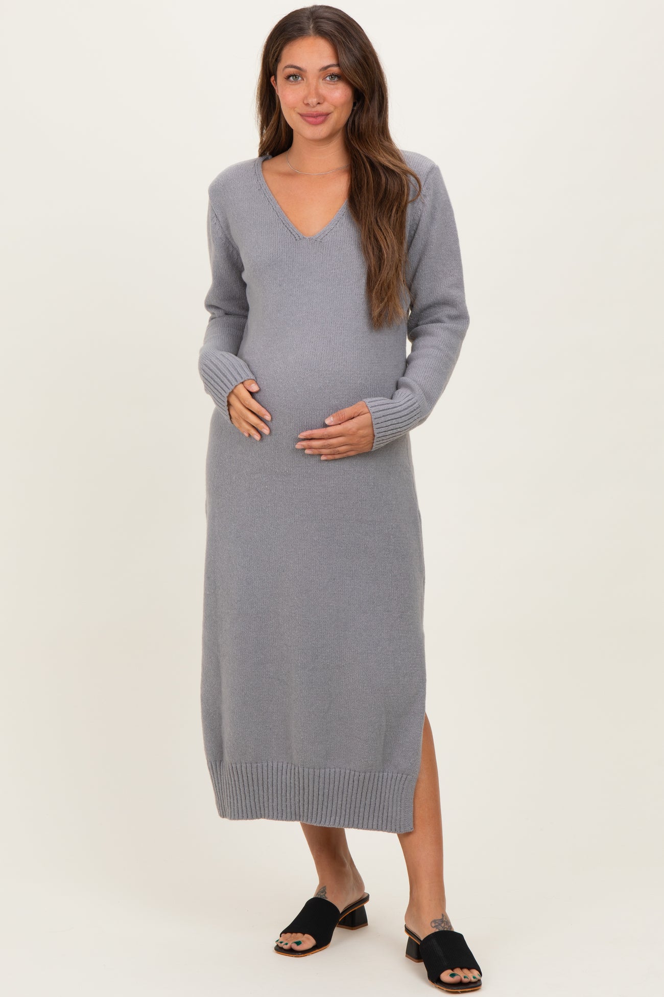 Heather Grey V-Neck Relaxed Fit Maternity Sweater Dress