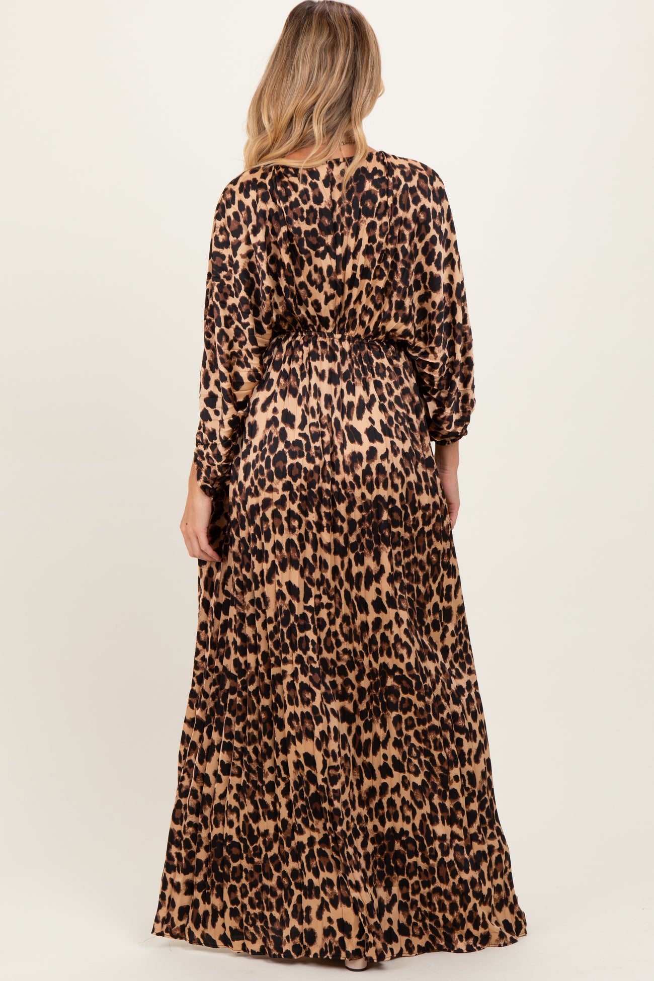 Leopard Pleated V Neck Satin Maternity Maxi Dress