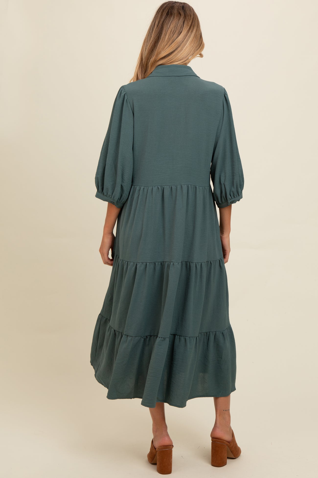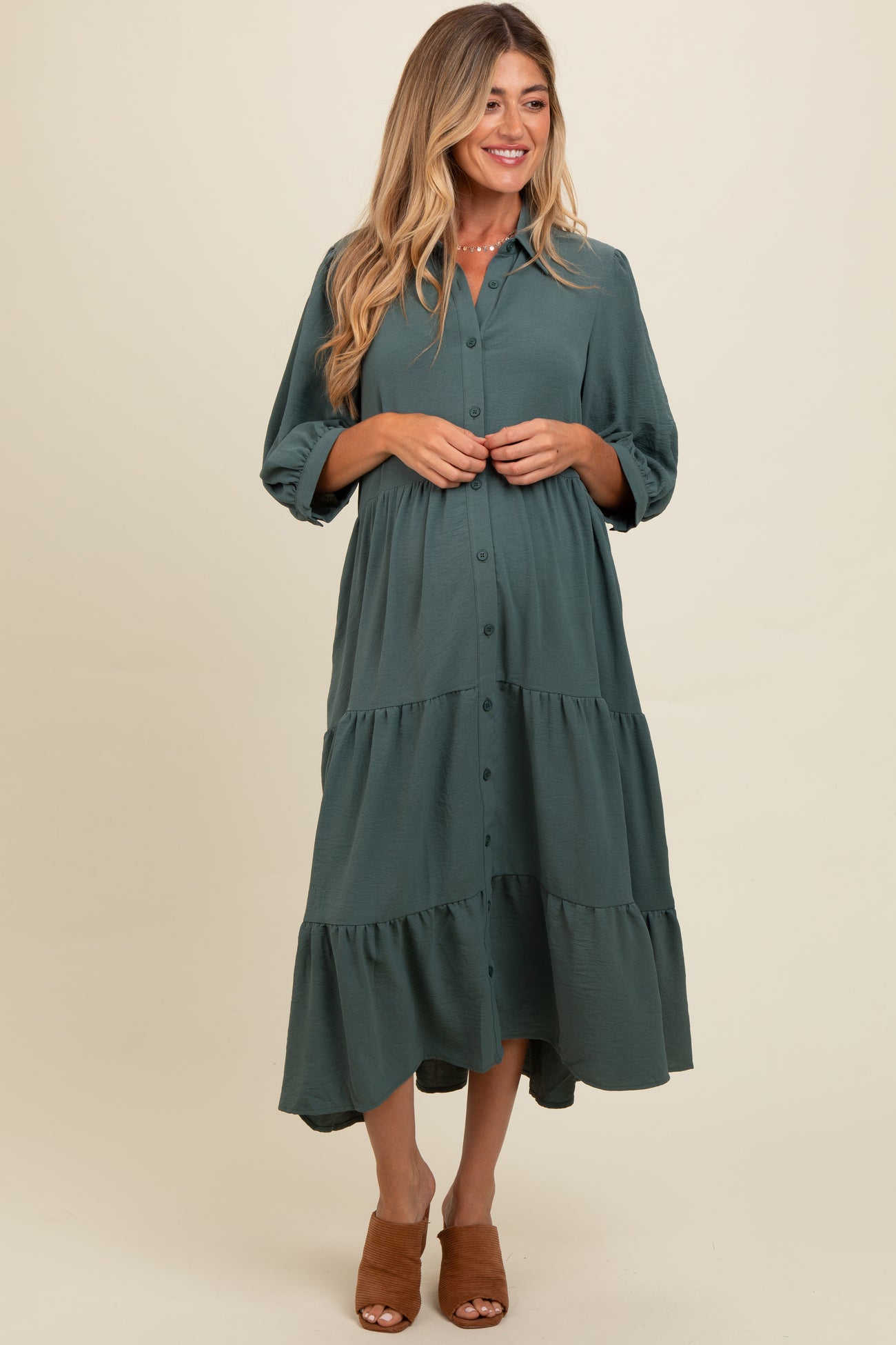 Light Olive Tiered Button Down Maternity Midi Dress