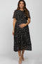 A chiffon maternity midi dress featuring a rounded neckline, short ruffle sleeves, a pleated skirt, a keyhole back with a button closure and double lined for added coverage. This style runs big.