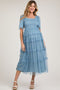 A floral print maternity maxi dress featuring short sleeves, a smocked top, a ruffle hem and a square neckline.