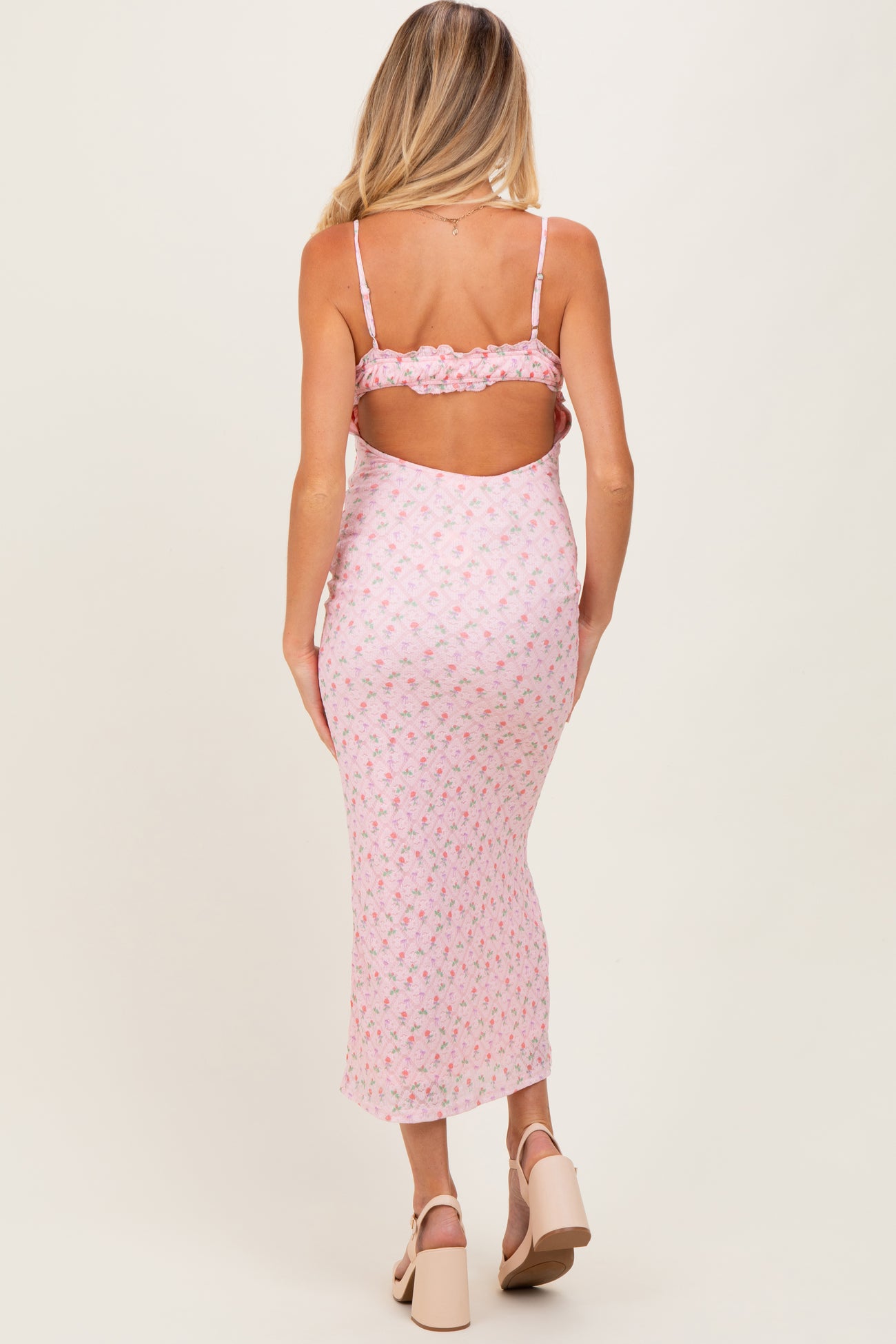 Light Pink Rose Print Jacquard Front Tie Cutout Maternity Maxi Dress