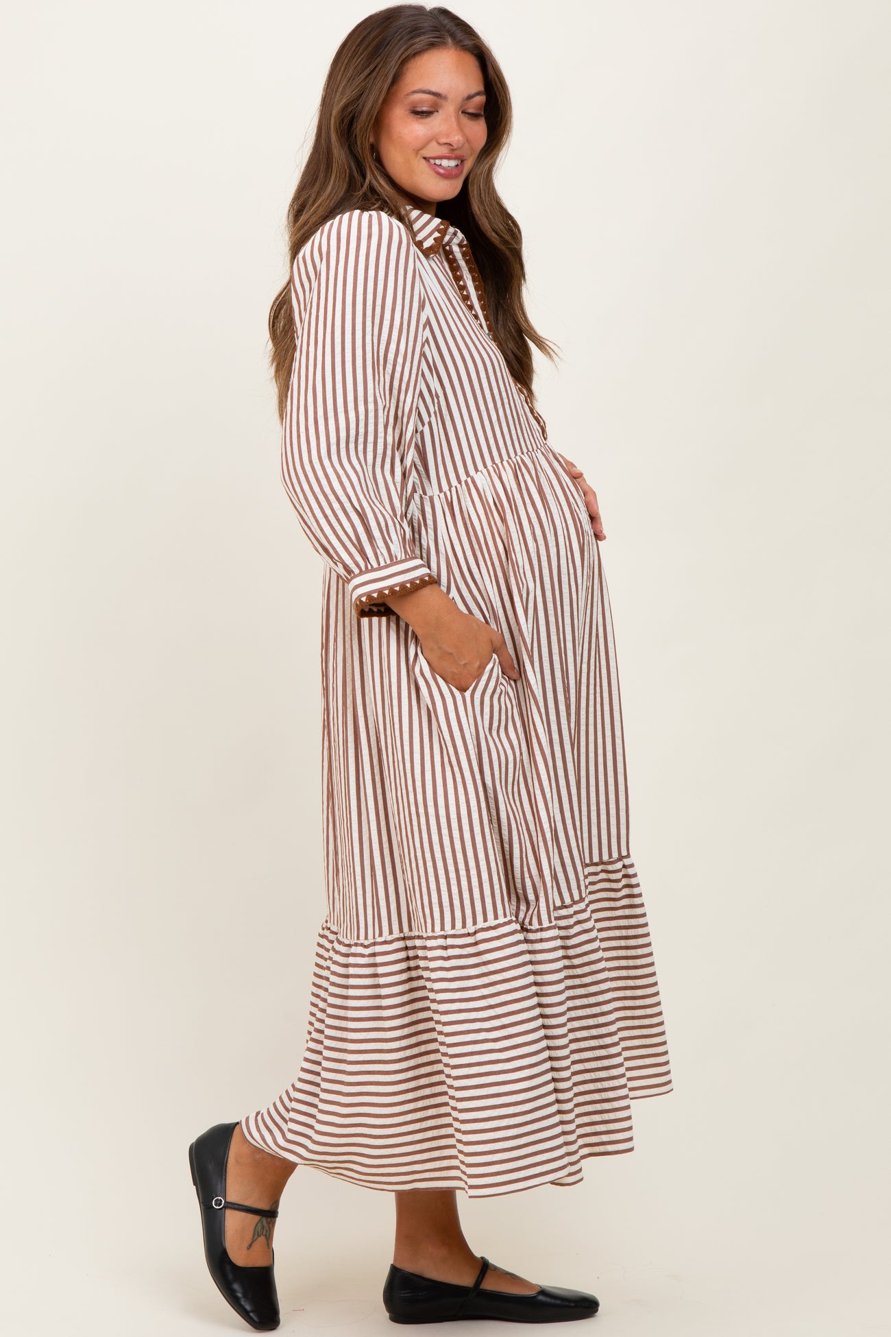 Mocha Striped Scallop Trim 3/4 Sleeve Maternity Midi Dress