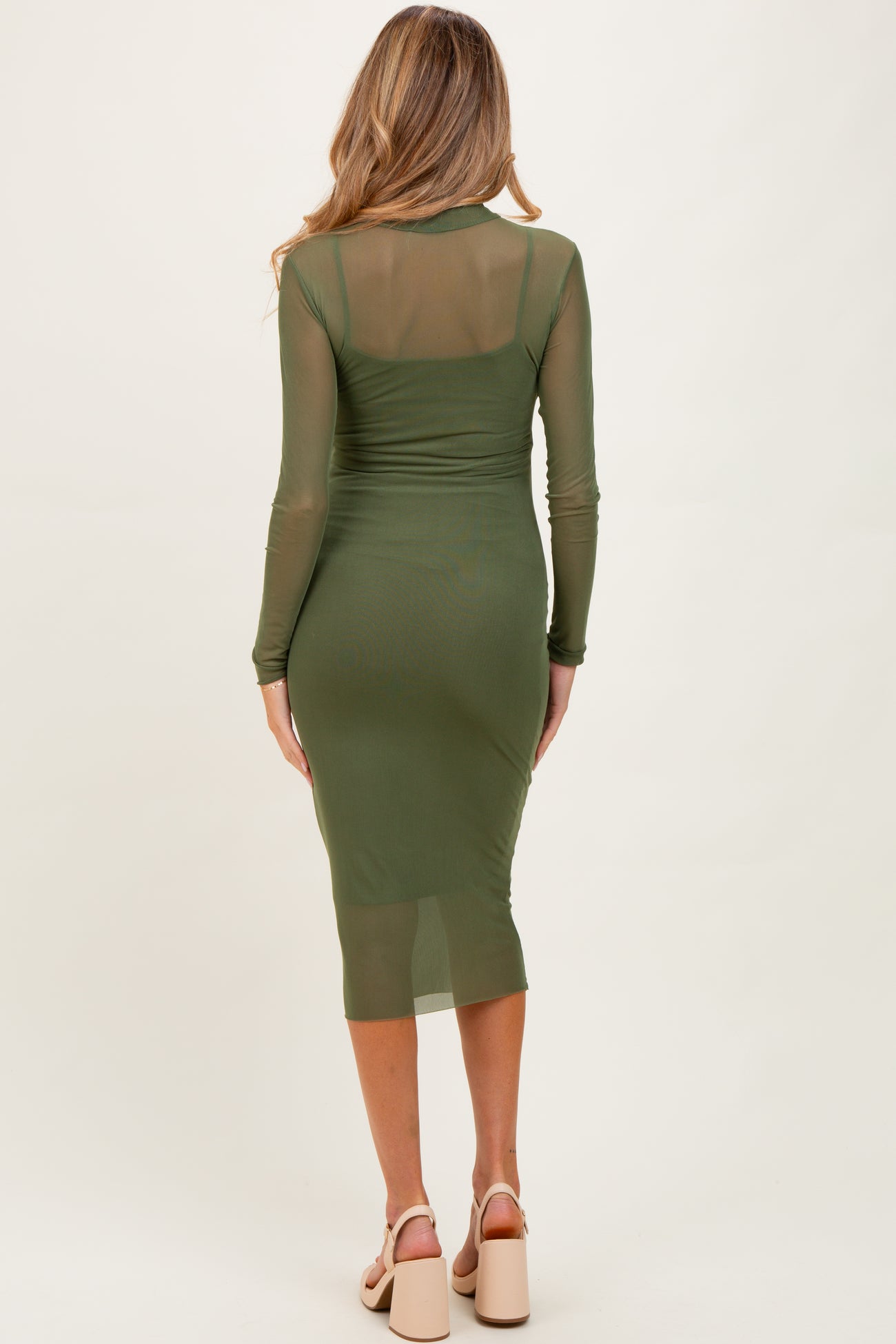 Olive Green Mesh Overlay Fitted Maternity Midi Dress