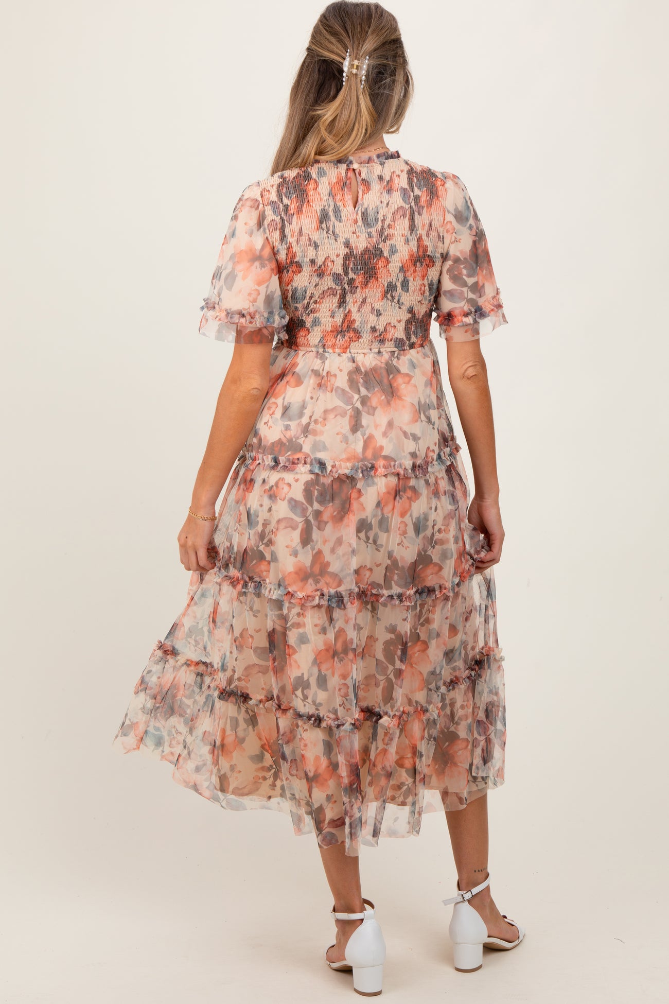 Peach Floral Mesh Smocked Maternity Midi Dress