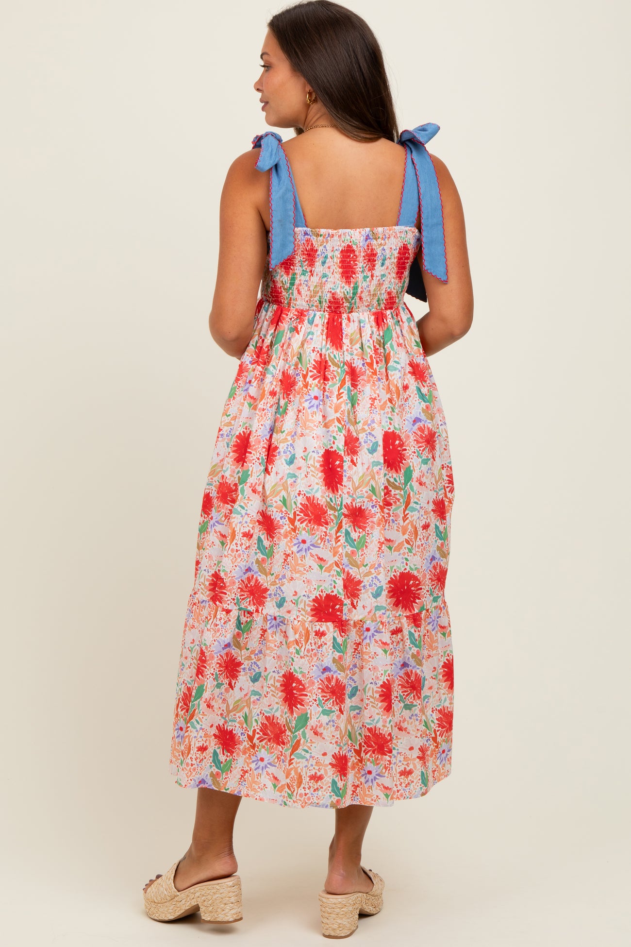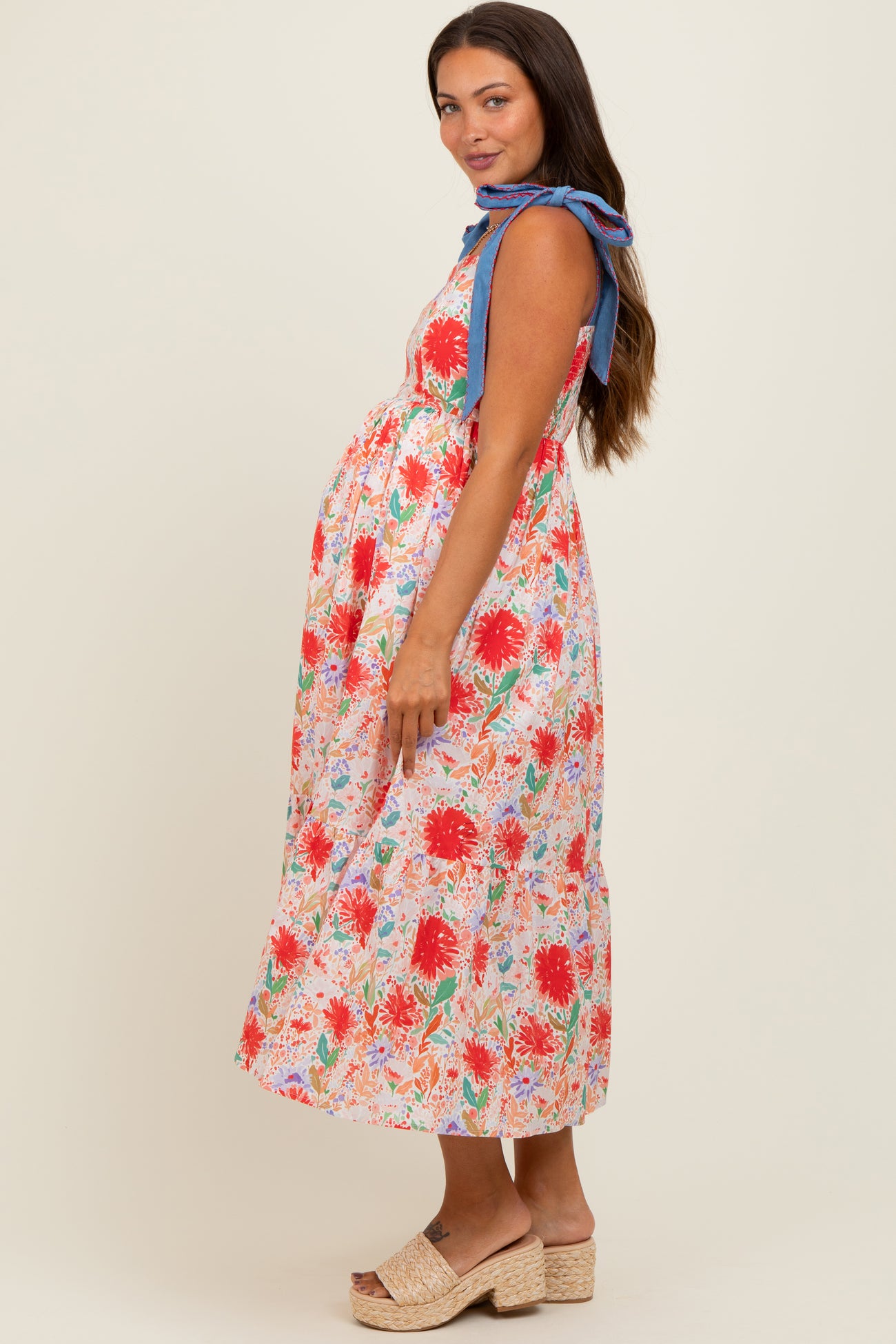 Red Floral Contrast Shoulder Tie Maternity Midi Dress