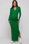 A maternity maxi dress featuring a deep v-neckline with ruffle trim and adjustable drawstring. Also features a halter strap, a tie at the back, an an A-line skirt with ruffle trim. Double lining.