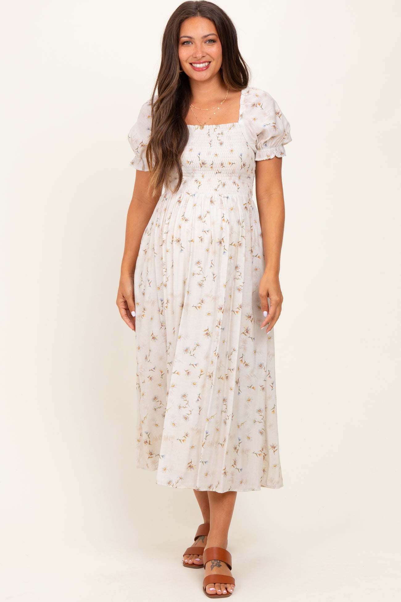 Yellow Floral Printed Puff Sleeve Maternity Midi Dress