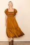 A velvet dress featuring a squared neckline, a smocked top, short puff sleeves, and a gathered bottom tier.