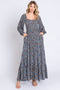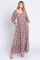 A floral maxi dress featuring a sweetheart neckline, long puff sleeves, a smocked top, side pockets, and a gathered bottom tier.