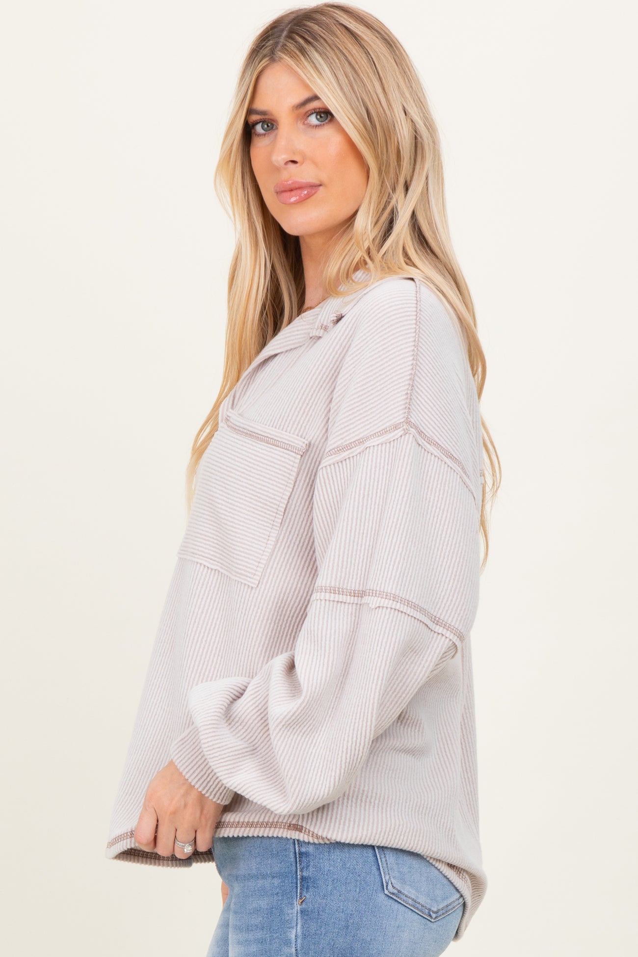 Beige Solid Ribbed Long Sleeve Pocketed Collared V-Neck Top