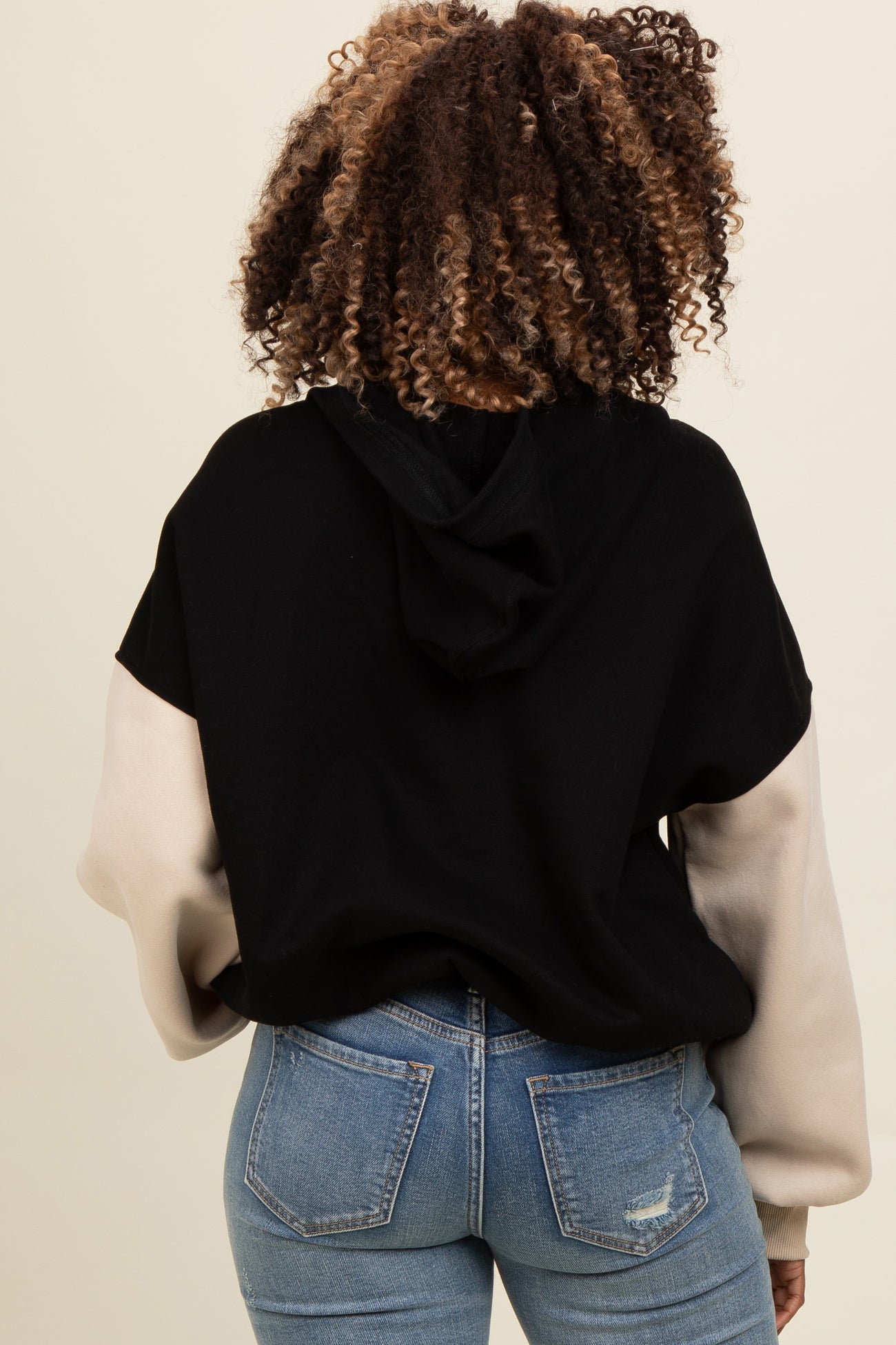 Stay cozy and stylish in our Black Colorblock Half Zip Hoodie. Featuring a chic black body with contrasting beige sleeves, this trendy pullover combines comfort and modern design. The half-zip front allows for adjustable coverage, while the relaxed fit and soft fabric make it perfect for layering or wearing solo. With ribbed cuffs and a convenient kangaroo pocket, this hoodie is your go-to for casual outings or lounging at home. Pair it with your favorite jeans or leggings for an effortlessly cool look all season long. Elevate your wardrobe basics today!