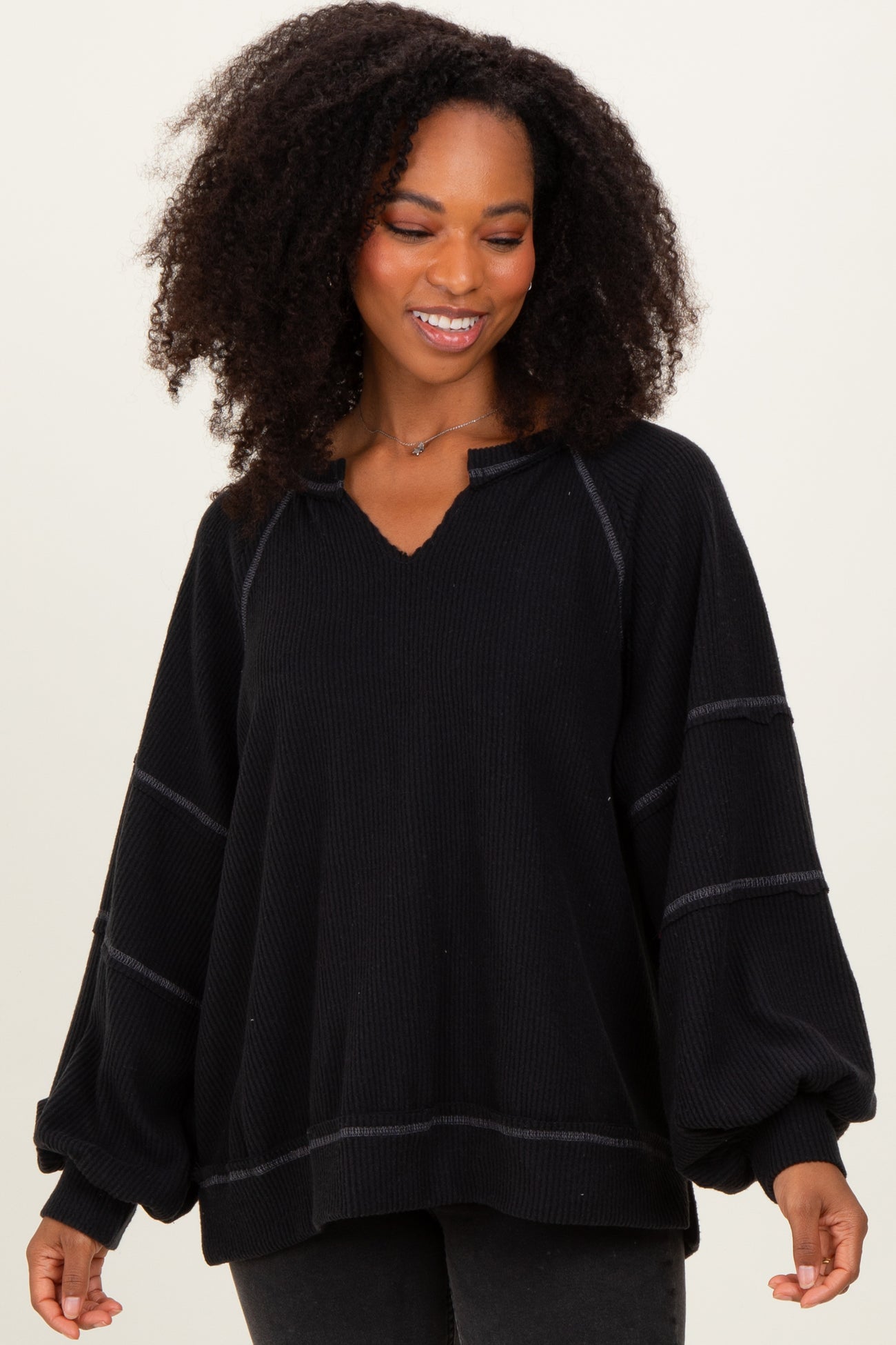 Black Solid Rib Long Sleeve V-Neck Oversized Tunic Top