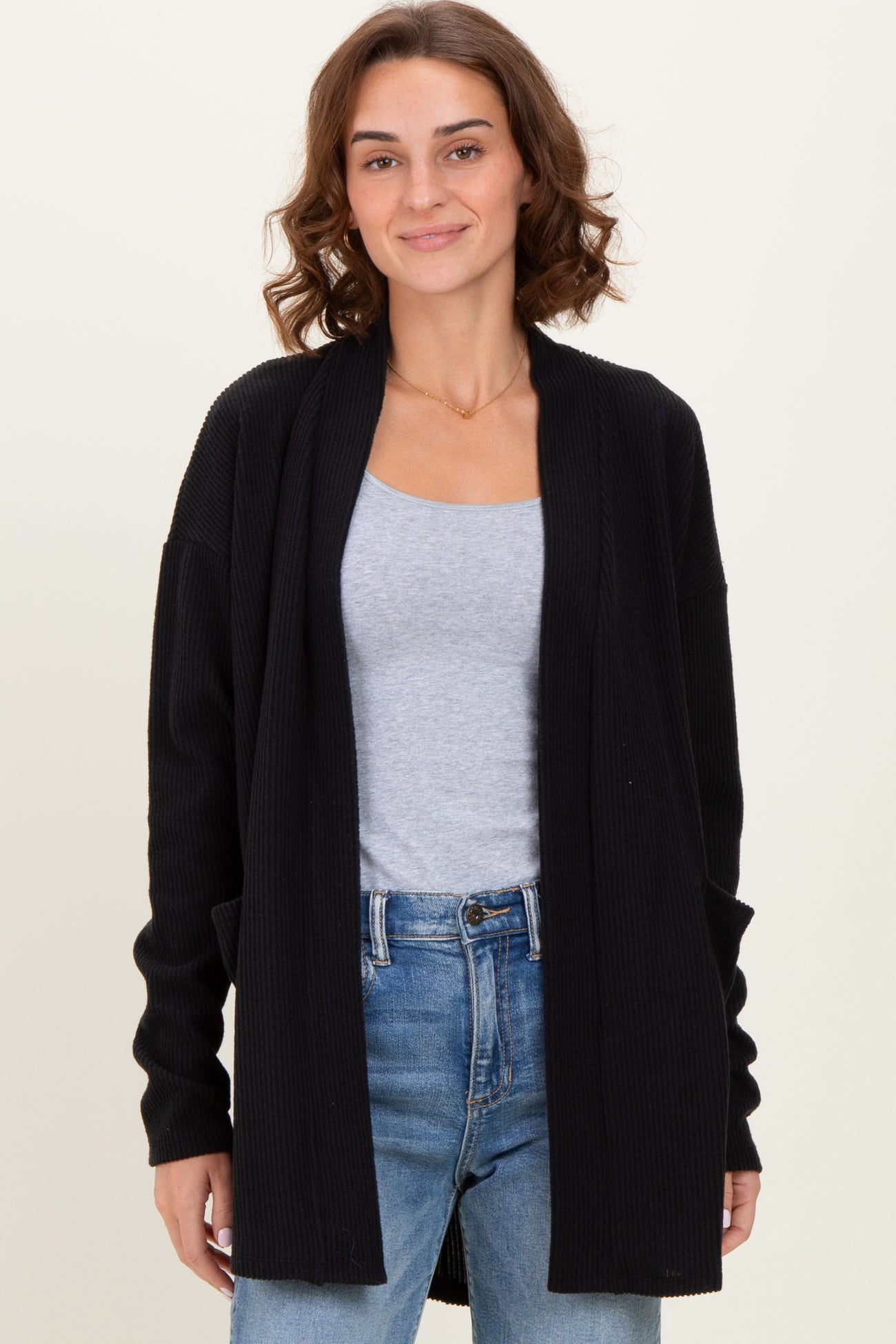 Stay cozy and stylish with our Black Solid Ribbed Long Sleeve Open Front Pocket Cardigan. Crafted from a soft, ribbed knit fabric, this versatile cardigan offers a relaxed fit perfect for layering over your favorite tops. Featuring a classic open front design and convenient side pockets, it combines comfort and practicality seamlessly. Whether paired with jeans for a casual look or dressed up for the office, this timeless black cardigan is a must-have essential for your wardrobe. Easy to wear anytime, anywhere—your go-to piece for effortless chic.