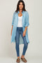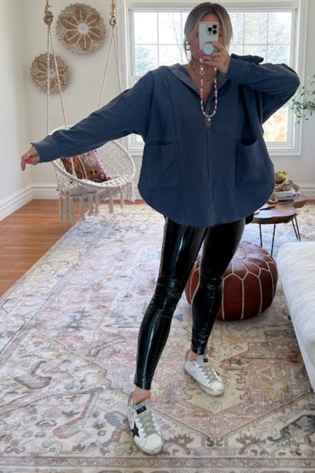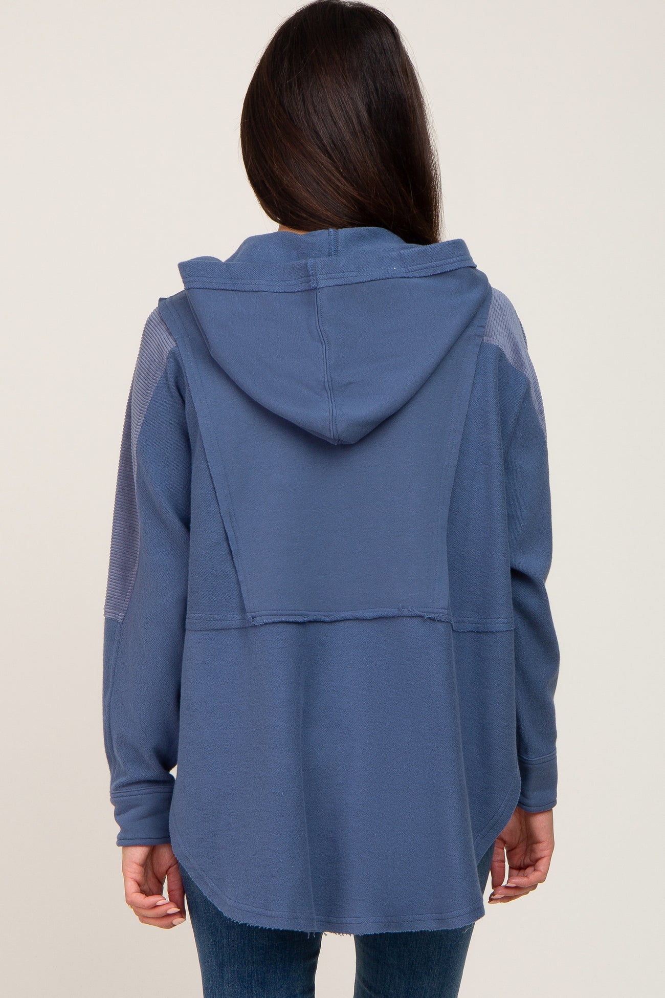 An ultra-soft, mixed knit top featuring front snap buttons, front pockets, a hood, a rounded hemline with a hi-low hem and raw edge trim.