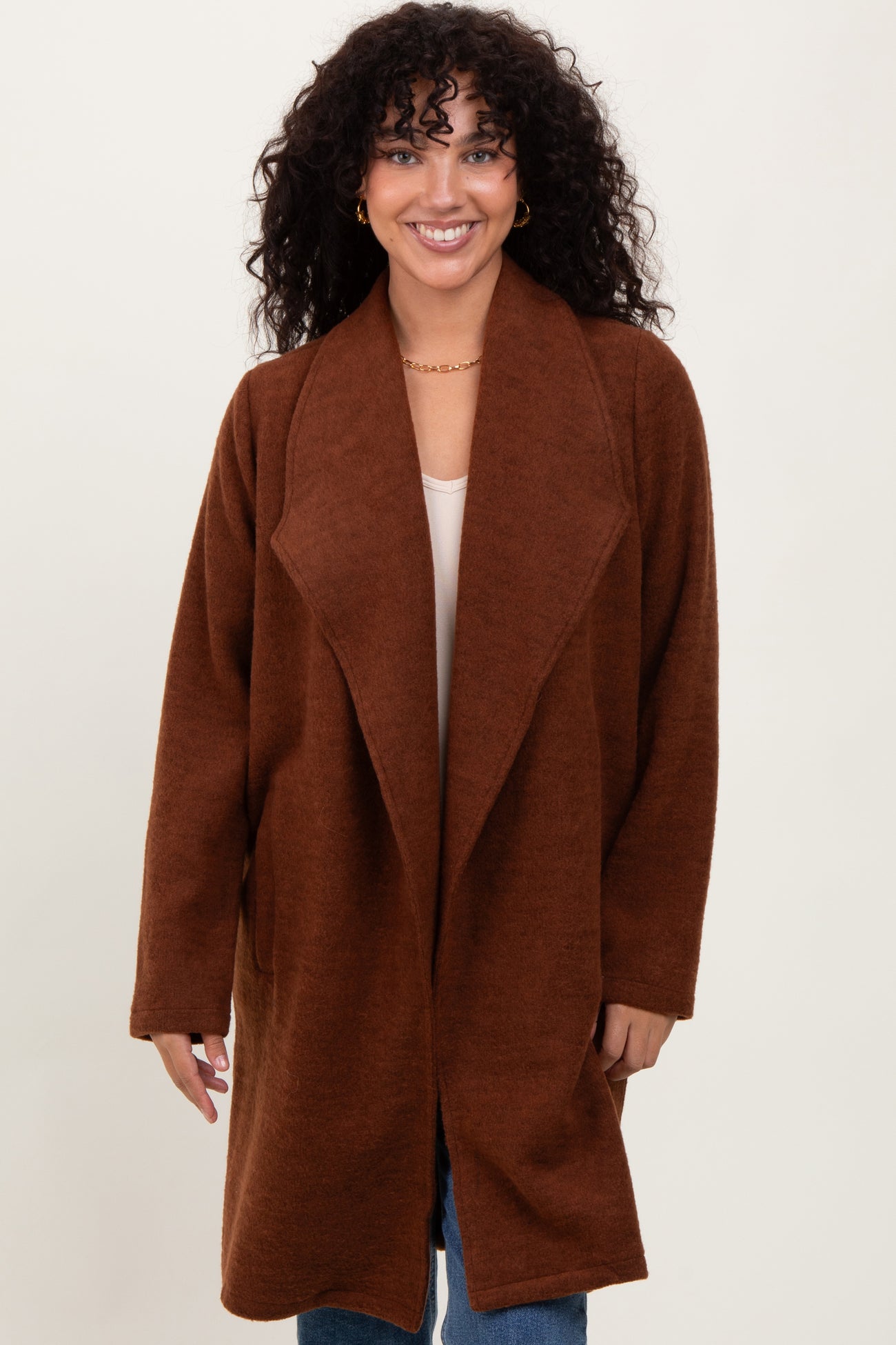 Elevate your everyday look with this Brown Knit Relaxed Fit Coat Jacket. Crafted from a soft, cozy knit fabric, it offers warmth and comfort for cooler days. The relaxed fit ensures an easy, flattering silhouette, while the open front and large lapels add a touch of casual elegance. Featuring convenient front pockets for your essentials and long sleeves for extra coverage. Perfect for layering over your favorite tops and jeans, this versatile coat jacket is a must-have staple for your fall and winter wardrobe. Stylish, comfortable, and effortlessly chic!