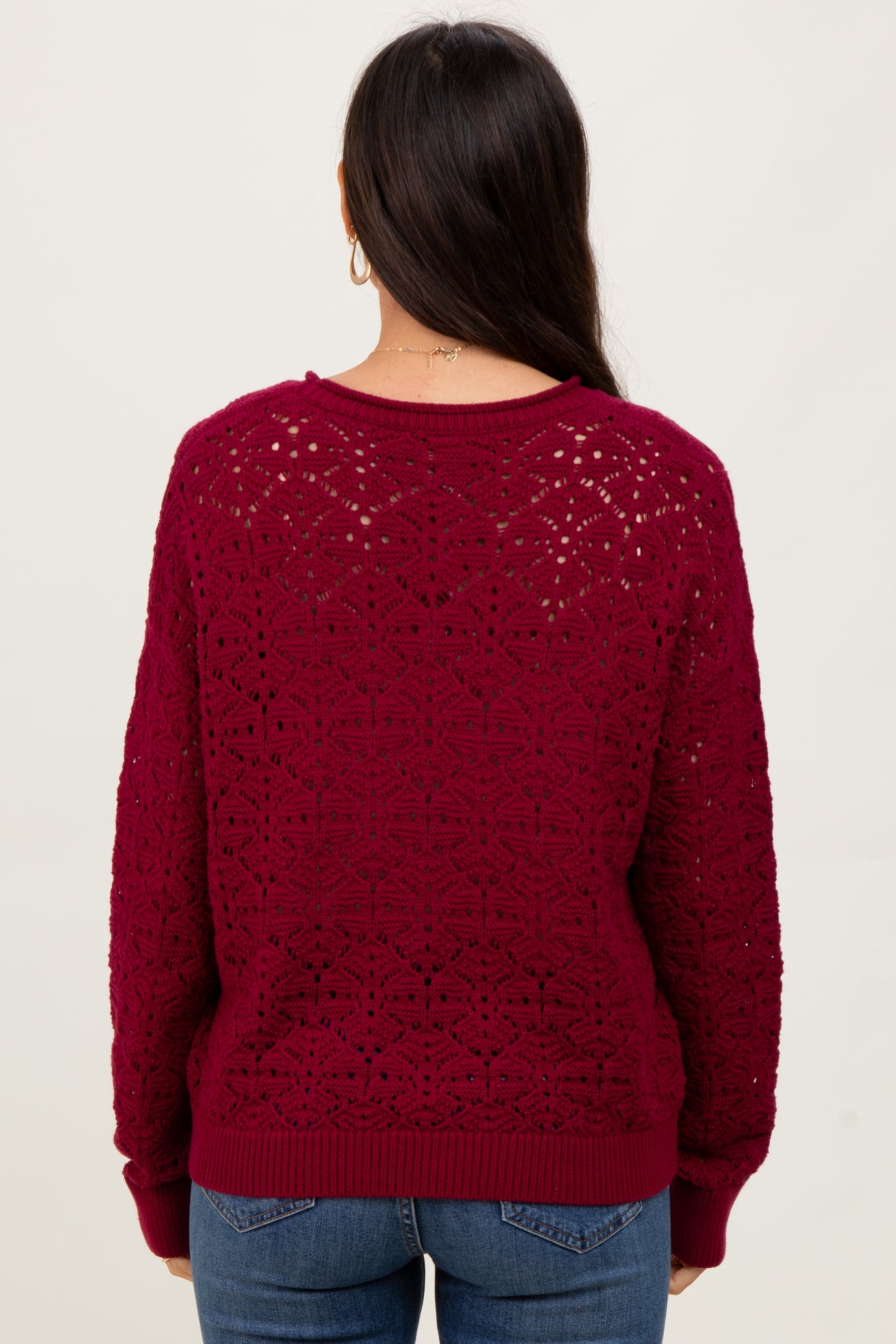 Burgundy Crochet Knit Drop Shoulder Sweater