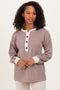 Elevate your casual wardrobe with this long sleeve ribbed top featuring a stylish contrast button detail at the neckline. Designed for comfort and versatility, this top offers a relaxed fit with dropped shoulders and cuffed sleeves, perfect for layering or wearing on its own. The soft, textured fabric adds dimension, while the button placket creates an effortless yet chic look. Pair it with your favorite jeans or skirts for an easygoing style that transitions seamlessly from day to night. Ideal for cozy days and casual outings, this top is a must-have staple for any trendy closet.
