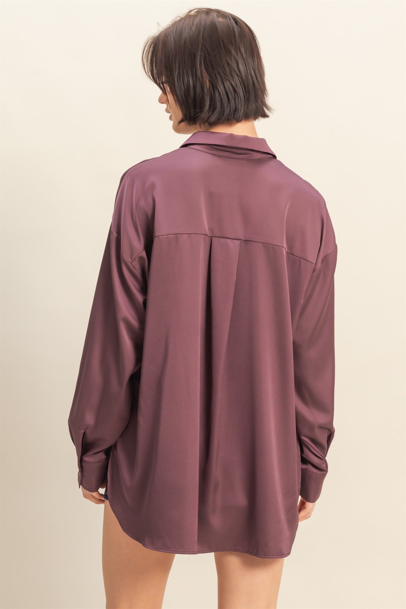 Burgundy Long Sleeve Oversized Satin Maternity Shirt
