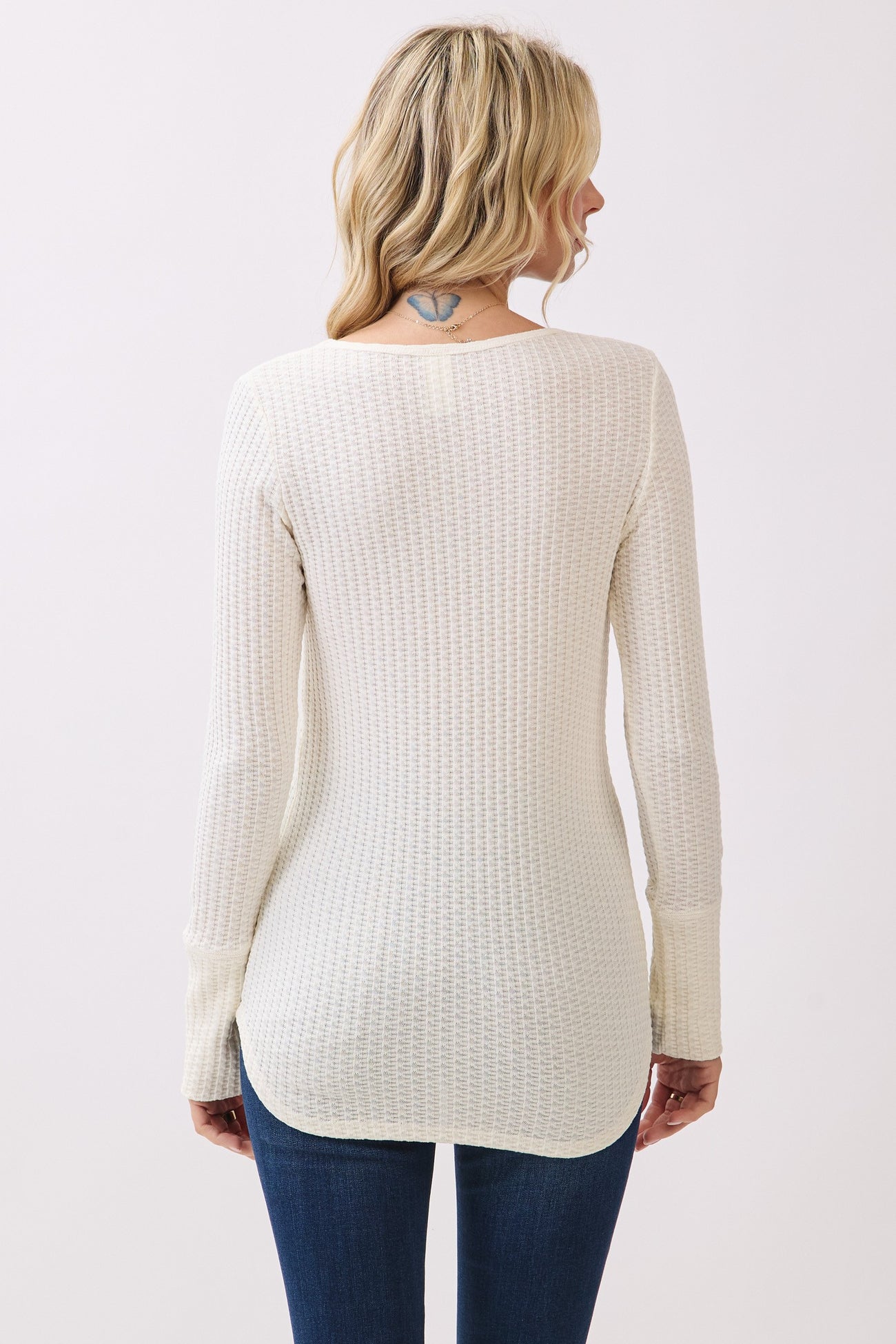 Stay cozy and chic in our Cream Waffle Rib Knit Henley Top, a wardrobe essential for effortless style. Crafted from a soft, textured waffle knit fabric, this long-sleeve top features a flattering scoop neckline and a classic button-front Henley placket for added detail. The ribbed cuffs and curved hem provide a comfortable, form-flattering fit that pairs perfectly with your favorite jeans or leggings. Ideal for layering or wearing on its own, this versatile top brings warmth and timeless appeal to any casual look. Embrace comfort without compromising on style.