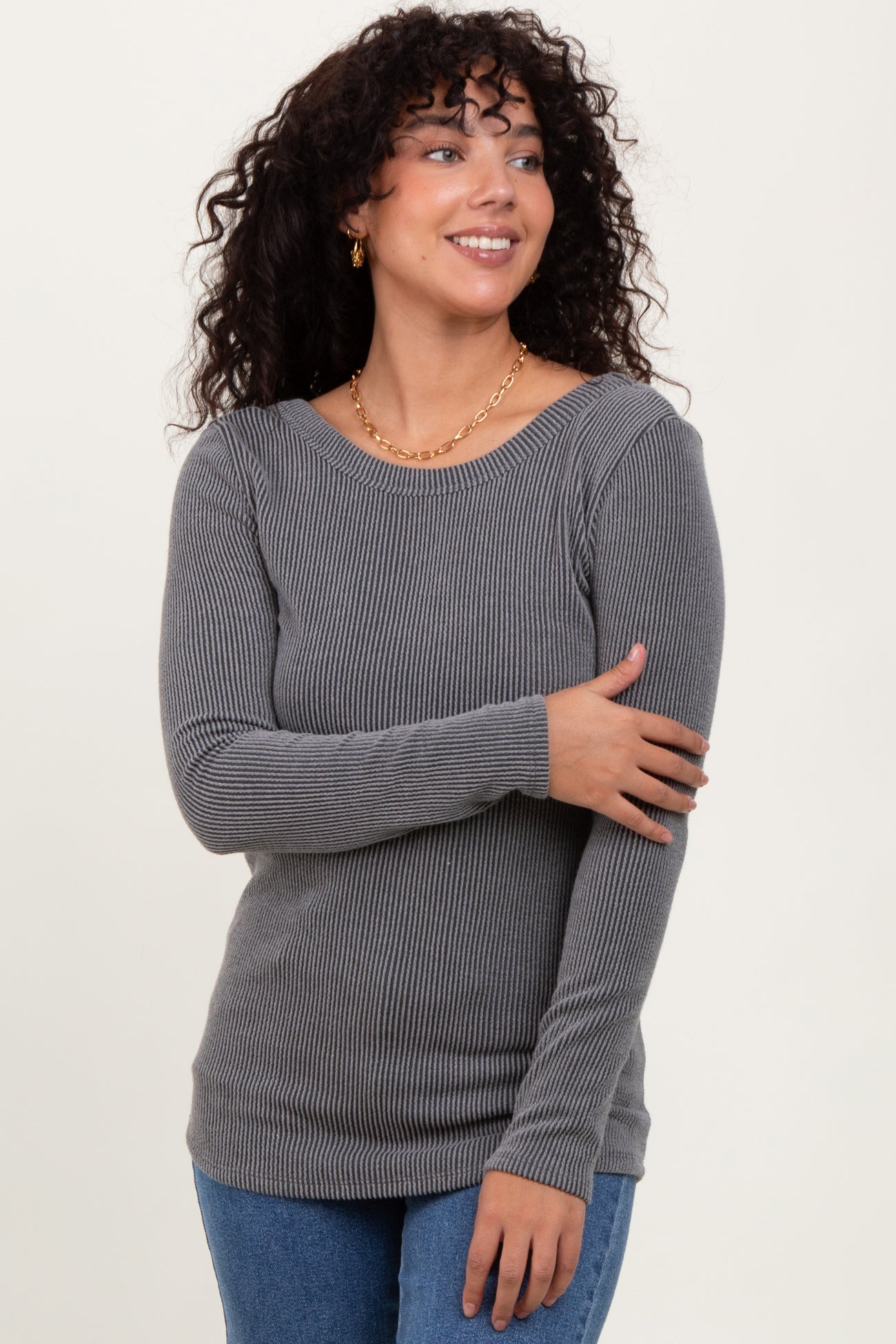 Grey Ribbed Scoop Neck Long Sleeve Top