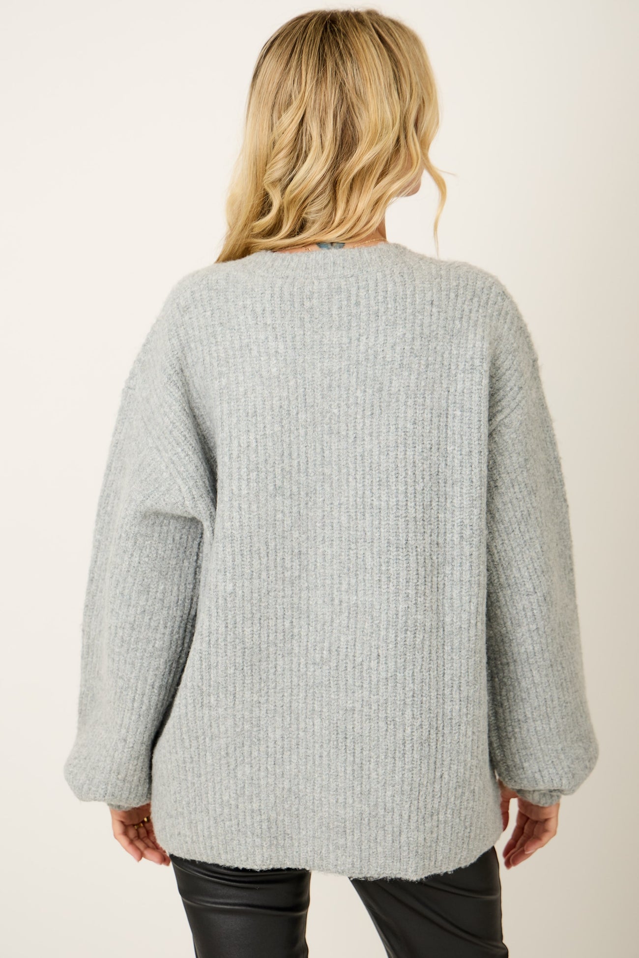 Stay cozy and stylish with this Heather Grey Knit Oversized Button Cardigan. Crafted from a soft, ribbed knit fabric, it features a relaxed fit with dropped shoulders and balloon sleeves for a trendy, laid-back look. The neutral heather grey tone makes it easy to pair with any outfit, while the large buttons add a chic, timeless touch. Perfect for layering over your favorite tops or dresses, this cardigan effortlessly blends comfort and casual elegance. Ideal for cool days, it's a versatile wardrobe staple you’ll reach for again and again. Available in multiple sizes for the perfect fit.