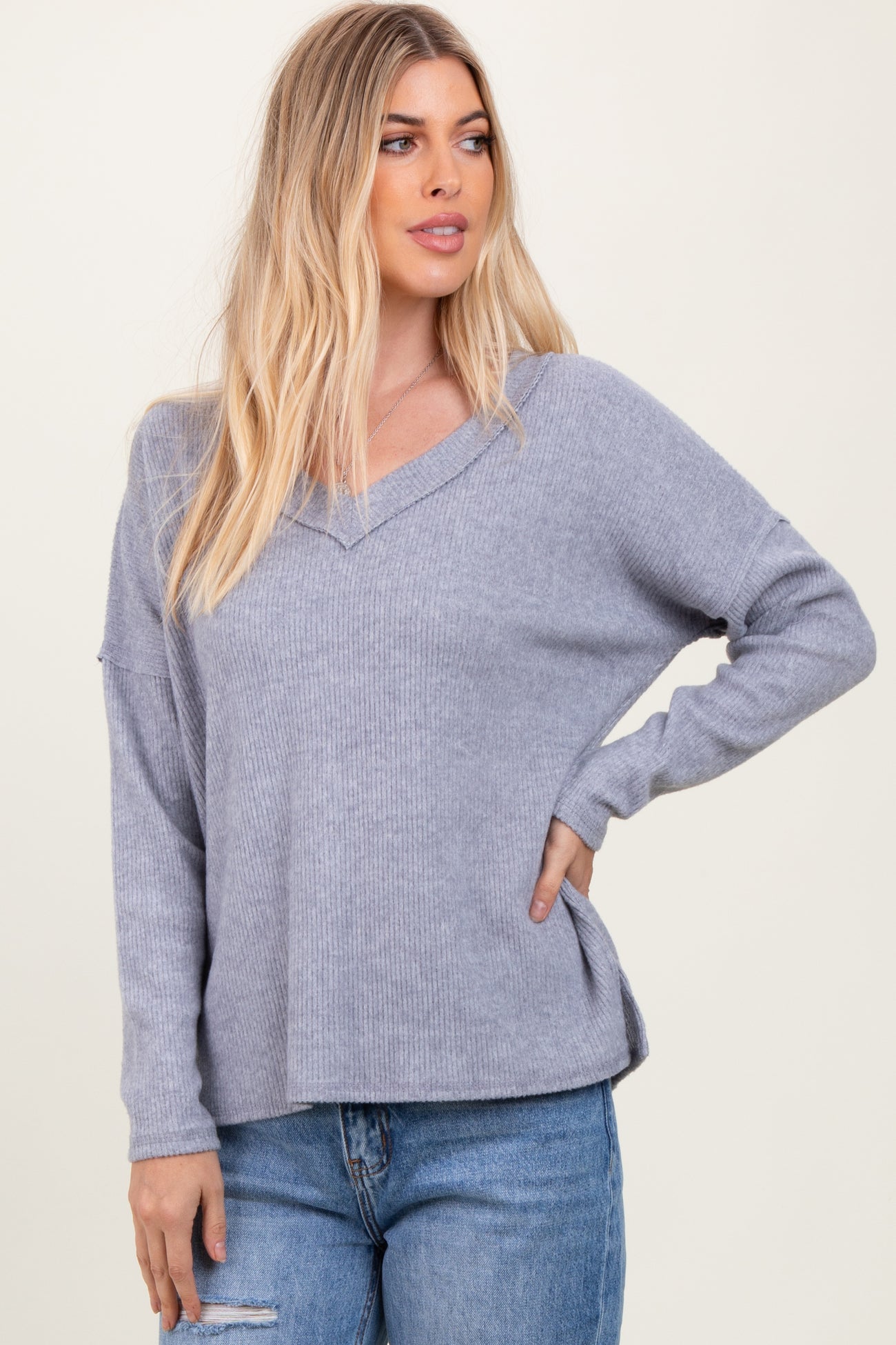 Heather Grey Ribbed V-Neck Long Sleeve Top