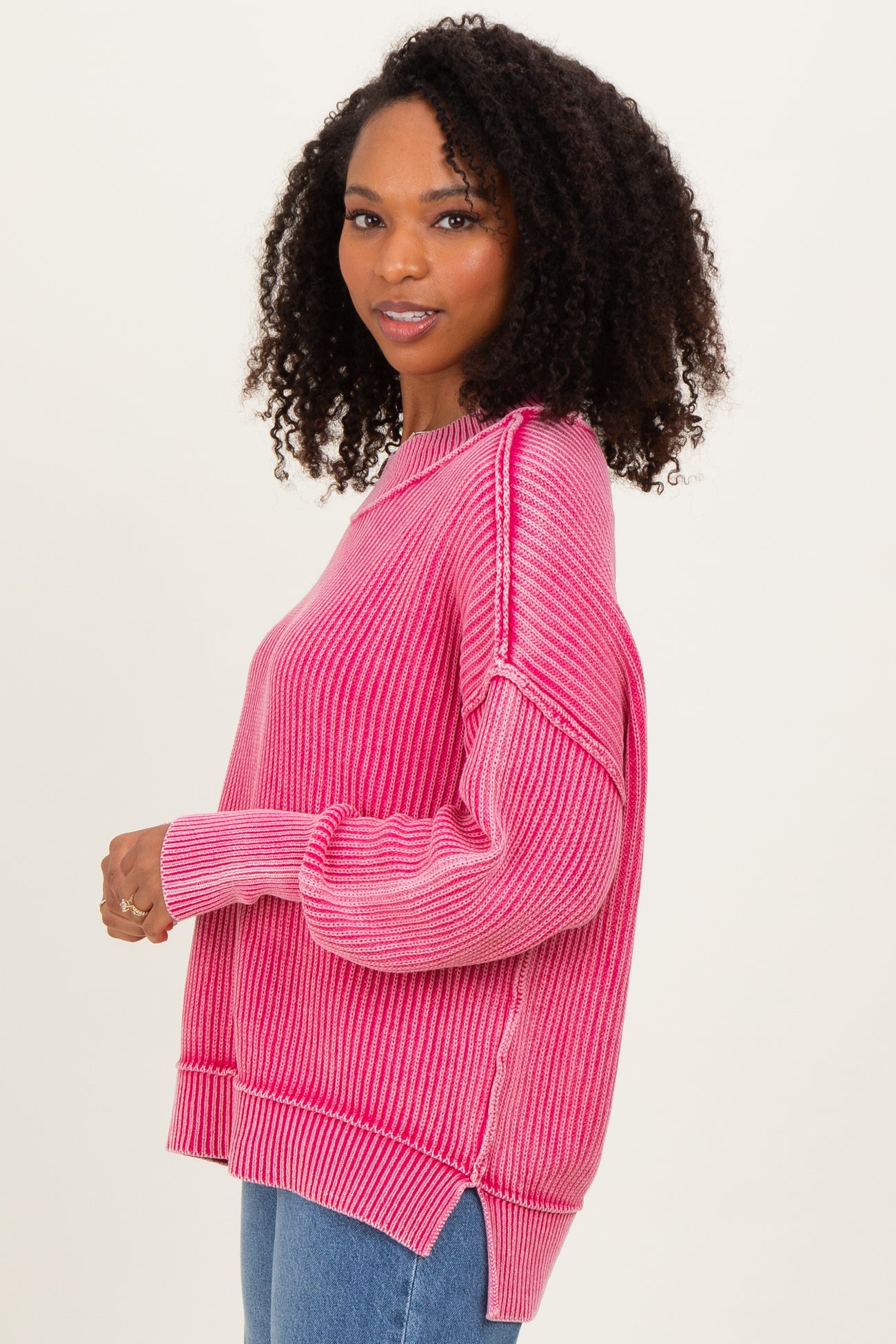 Hot Pink Washed Side Slit Oversized Sweater