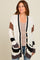 Elevate your cozy style with our Ivory Crochet Knit Stripe Detail Oversized Cardigan. Featuring a relaxed, oversized fit, this cardigan combines comfort and chic with its soft crochet knit fabric. The ivory base is beautifully accented with bold black, brown, and gray stripes on the sleeves and hem, adding a modern touch to your layering game. Finished with a classic button-front closure and convenient front pockets, it's perfect for chilly days or casual outings. Pair with jeans and a simple tee for effortless cool, or layer over dresses for a stylish boost. A must-have staple for your fall and winter wardrobe!