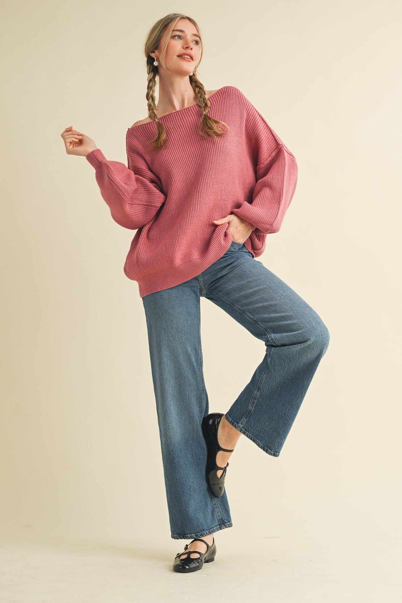 Mauve Balloon Sleeve Boat Neck Knit Sweater