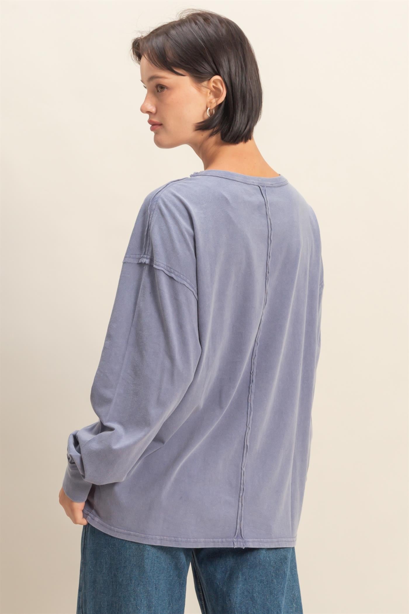 Elevate your casual wardrobe with our Navy Oversized Washed Long Sleeve Pocket Top. Made from ultra-soft, breathable fabric, this relaxed-fit top offers all-day comfort and effortless style. The washed navy hue adds a vintage-inspired touch, while the oversized silhouette ensures a laid-back, cozy fit. Featuring a classic crew neckline and a handy chest pocket, this long sleeve top pairs perfectly with your favorite jeans or leggings for a stylish, easygoing look. Ideal for layering or wearing solo, it's a versatile essential that blends comfort and cool with ease.