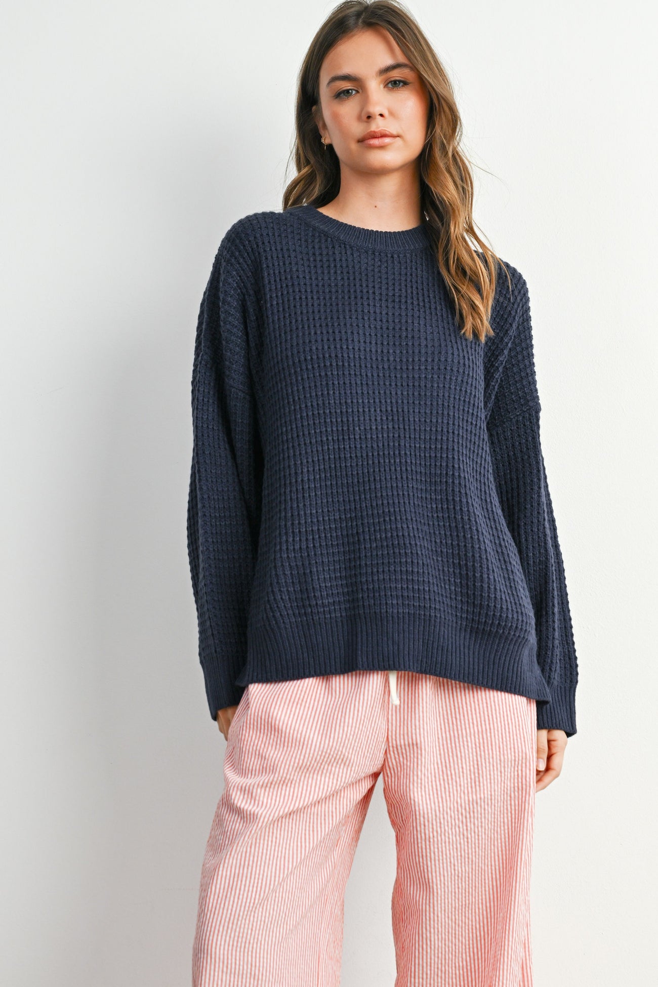 Navy Waffle Knit Side Slit Sweater
