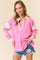 Step up your casual style with our Pink Colorblock Stripe Polo Pullover Top! Featuring a vibrant pink base with contrasting cream and striped accents on the collar, cuffs, and sleeves, this pullover blends sporty charm with cozy comfort. The relaxed fit and soft fabric make it perfect for laid-back days, while the open V-neck polo collar adds a touch of classic cool. Pair it effortlessly with your favorite distressed denim shorts or jeans for an easy-going, chic look. Whether you’re running errands or meeting friends, this top brings a fresh, fun vibe to your everyday wardrobe!